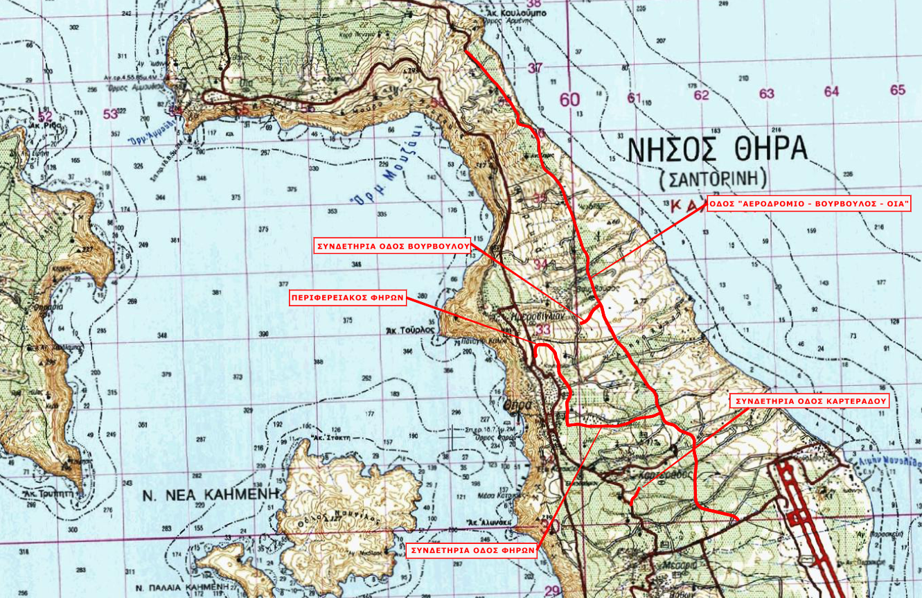 Το έργο αφορά στην ολοκλήρωση εργασιών στους οδικούς άξονες Αεροδρόμιο – Φηρά – Βουρβούλο – Οία μήκους 8,9 km και βελτίωση/κατασκευή των συνδετήριων οδών αυτού, με τους οικισμούς Καρτεράδο, Βουρβούλο και Φηρά, συνολικού μήκους 3,9 km. Η κρατική εταιρεία "ΕΓΝΑΤΙΑ Α.Ε." είναι ο φορέας δημοπράτησης του έργου που υλοποιείται με χρηματοδότηση που ενέκρινε ο Περιφερειάρχης Ν. Αιγαίου μέσα από τους Ευρωπαϊκούς πόρους της Περιφέρειας.