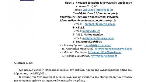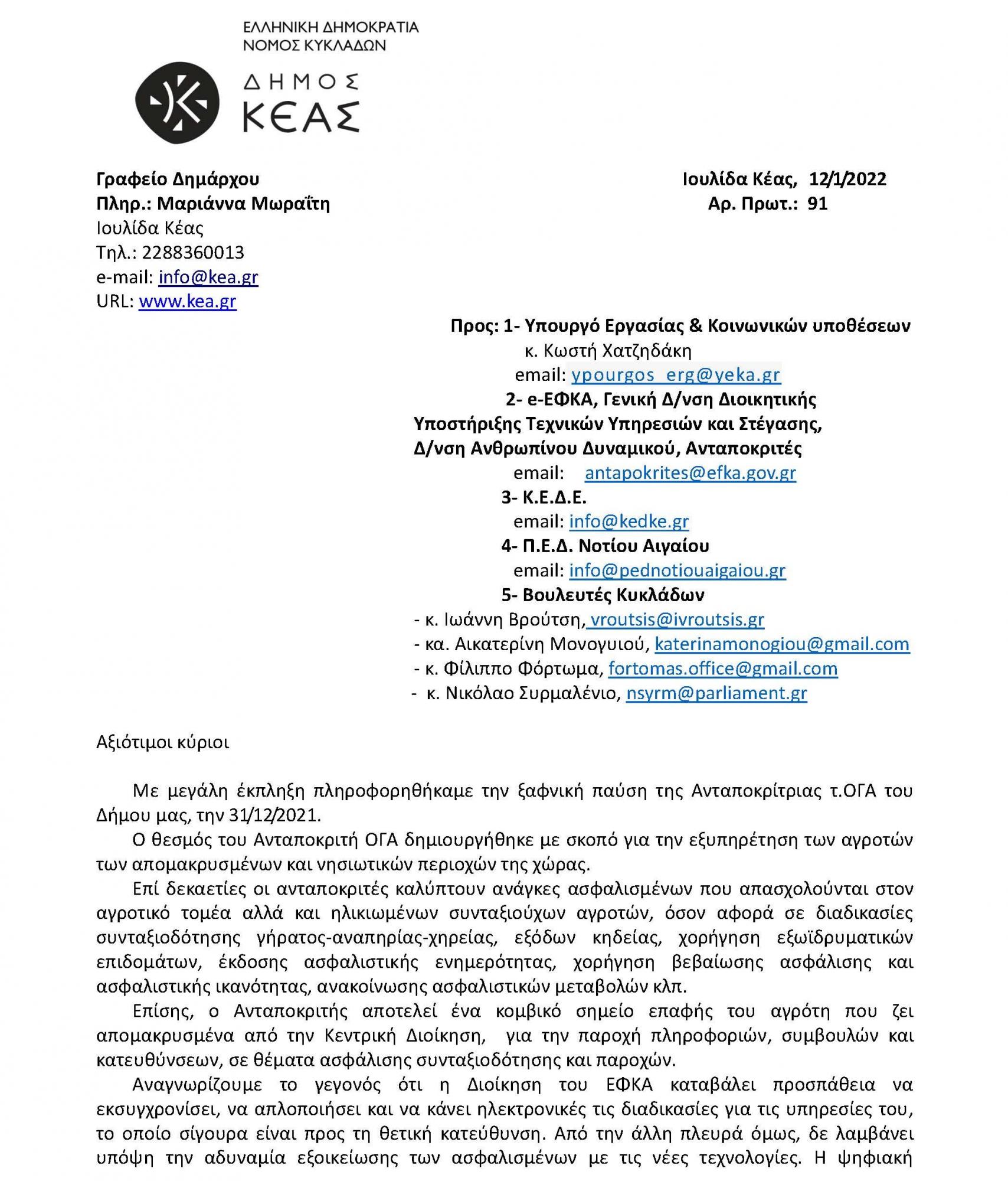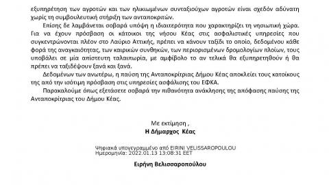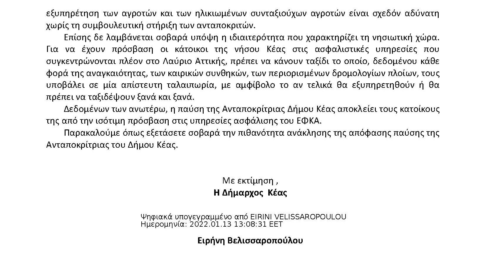 Με επιστολή της, η Δήμαρχος Κέας, κ. Ειρήνη Βελισσαροπούλου, διαμαρτυρήθηκε στους αρμόδιους φορείς για την ξαφνική παύση της Ανταποκρίτριας του ΟΓΑ του Δήμου Κέας. Η απόφαση αυτή αποκλείει τους κατοίκους του νησιού από την ισότιμη πρόσβαση στις υπηρεσίες ασφάλισης του ΕΦΚΑ. Ζητά επομένως να εξεταστεί σοβαρά η πιθανότητα ανάκλησης της.