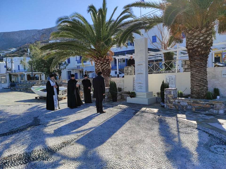 Παρόντες στο μνημόσυνο που τέλεσαν οι ιερείς Κωνσταντίνος Νομικός, Αντώνιος Δεσποτίδης και Ειρηναίος Πάσσαρης ήταν ο Δήμαρχος Αμοργού Ελευθέριος Καραΐσκος, μέλη του δημοτικού συμβουλίου και των τοπικών κοινοτήτων, οι προϊστάμενοι του Αστυνομικού Σταθμού και του Λιμενικού Σταθμού Αμοργού και κάτοικοι του νησιού.Μέσα σε κλίμα συγκίνησης έγινε κατάθεση στεφάνων και κρατήθηκε ενός λεπτού σιγή, ενώ οι παρόντες έψαλαν τον Εθνικό Ύμνο.