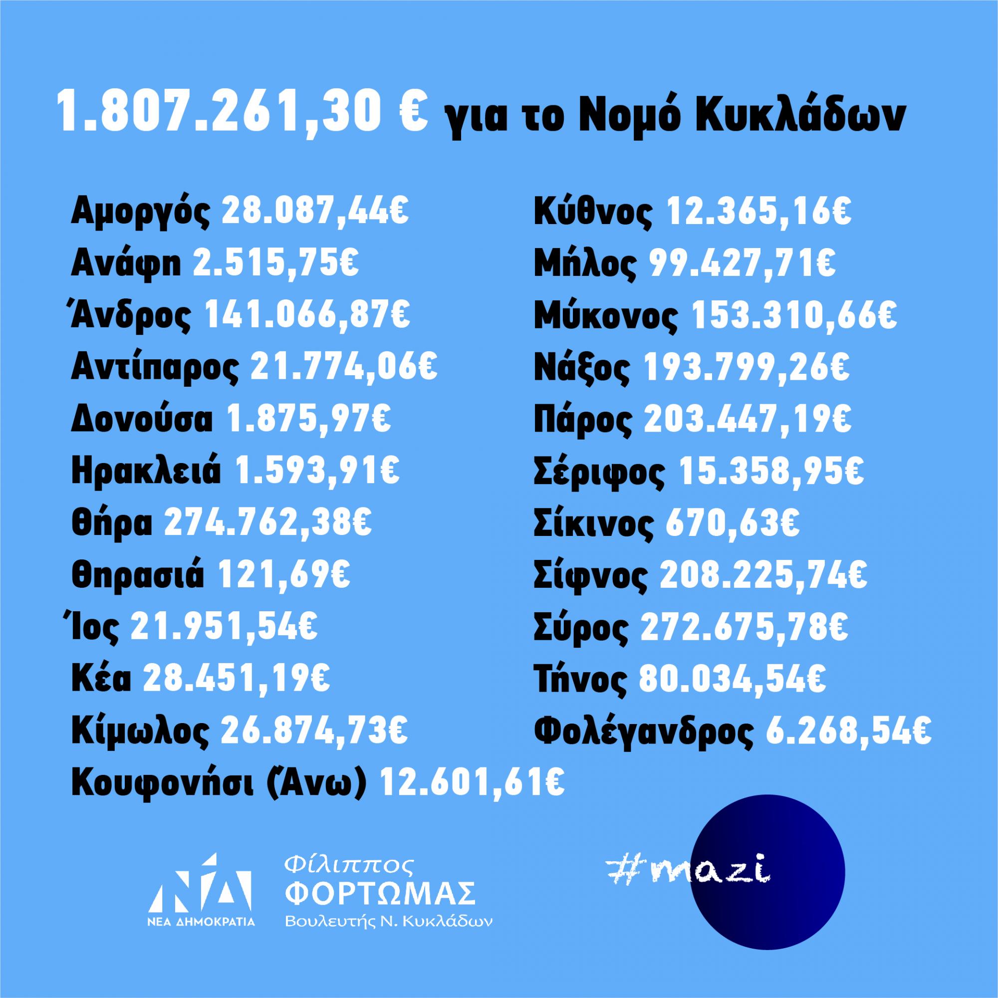Συγκεκριμένα, θα πιστωθεί συνολικά το ποσό των 8,2 εκατ. ευρώ, εκ των οποίων ποσό 3.324.503,83 € θα δοθεί στην Περιφέρεια Νοτίου Αιγαίου, ενώ ειδικότερα για το Νομό Κυκλάδων, θα πραγματοποιηθεί σταδιακή καταβολή ποσού 1.807.261,30 €. Οι λογαριασμοί των επιχειρήσεων θα εκκινήσουν να πιστώνονται από τη Μ. Δευτέρα 18/04/2022 και έπειτα, ενώ οι πληρωμές θα αφορούν αιτήσεις της 1ης Φάσης επιλεξιμότητας δαπανών για τη χρηματοδότηση μεταφοράς εμπορευμάτων του έτους 2021 και συγκεκριμένα της χρονικής περιόδου από 01.01.2021 έως 30.06.2021.