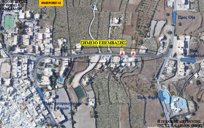 Η Δ.Ε.Υ.Α. Θήρας γνωστοποιεί κυκλοφοριακές ρυθμίσεις στην περιοχή Ημεροβίγλι και συγκεκριμένα, από τη διασταύρωση Αγ. Ιωάννη του Χρυσοστόμου έως τη διασταύρωση Κοντοχωρίου Οίας, λόγω απαραίτητων εργασιών, στα πλαίσια νέας σύνδεσης αποχέτευσης στο δίκτυο της Δ.Ε.Υ.Α.Θ..