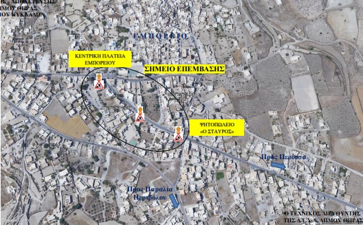 Η ΔΕΥΑ Θήρας γνωστοποιεί κυκλοφοριακές ρυθμίσεις στην περιοχή του Εμπορείου και συγκεκριμένα στο ύψος της κεντρικής πλατείας έως το ψητοπωλείο « Ο ΣΤΑΥΡΟΣ», λόγω απαραίτητων εργασιών στα πλαίσια του έργου με τίτλο «Δίκτυα Ύδρευσης Εμπορείου Θήρας». Κατά τη διάρκεια των εργασιών η διακοπή της κυκλοφορίας θα γίνεται ανά ρεύμα και ανά διαστήματα και θα ρυθμίζεται από το προσωπικό της αναδόχου εταιρίας. Οι κυκλοφοριακές ρυθμίσεις θα ξεκινήσουν το Σάββατο 20 Μαΐου, από τις 15:00 μ.μ., θα εκτελούνται και κατά τις νυχτερινές ώρες ώστε η ολοκλήρωση τους να γίνει το συντομότερο δυνατό. Οι εργασίες αναμένεται να ολοκληρωθούν την Τρίτη 24 Μαΐου. Σας ευχαριστούμε για την κατανόηση για την προσωρινή ενόχληση.