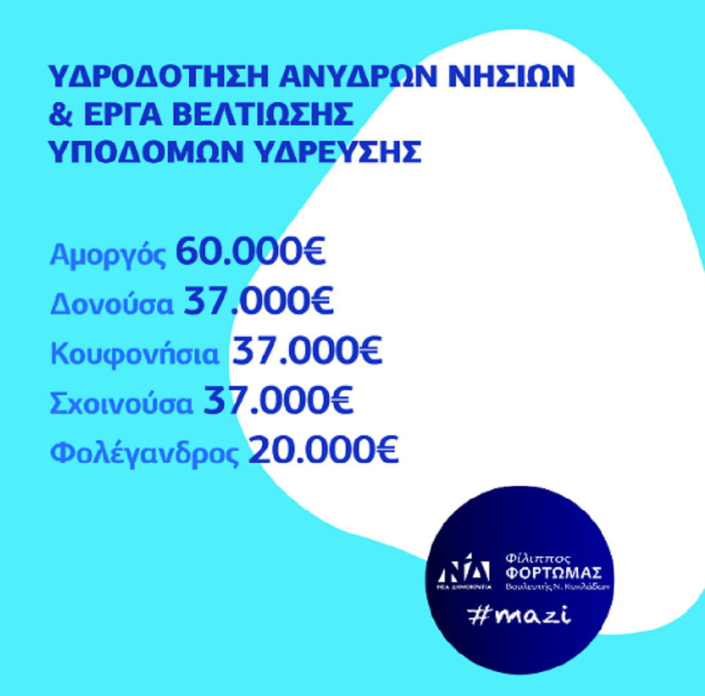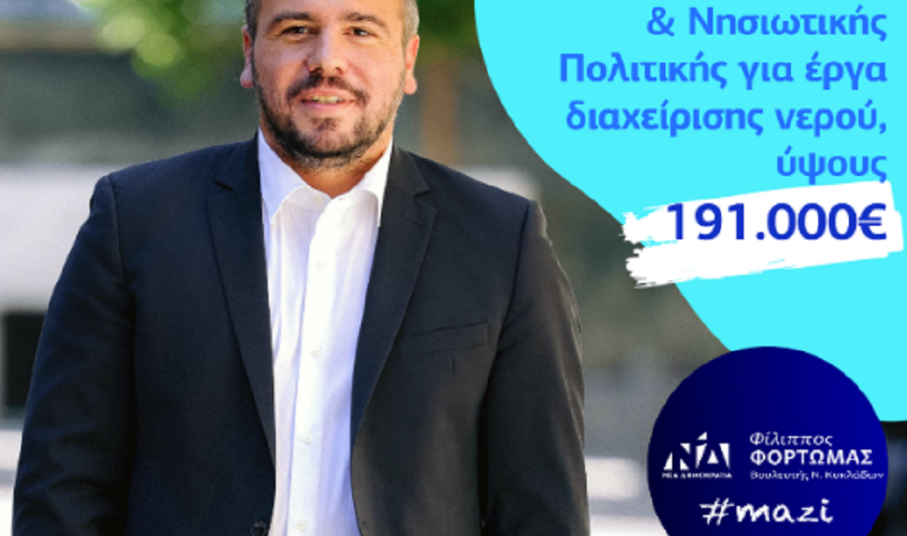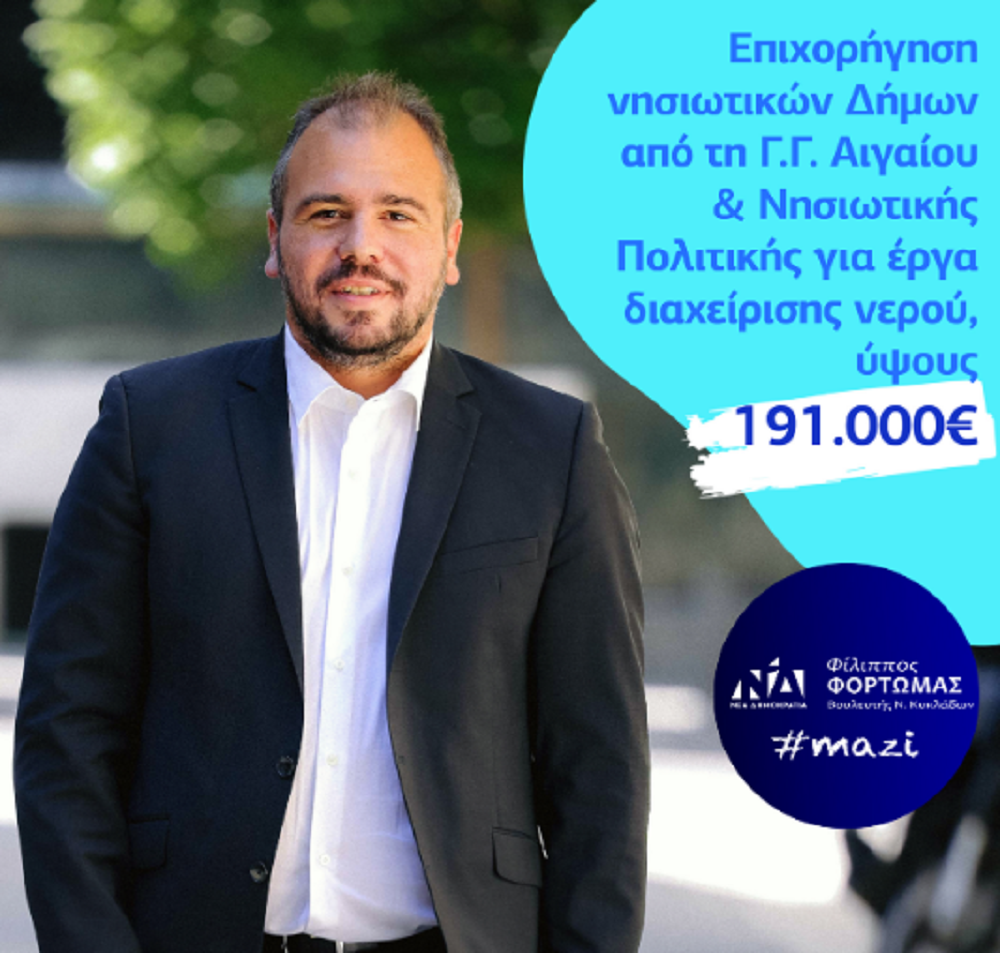 Τα συγχαρητήριά του εξέφρασε ο βουλευτής Κυκλάδων της Νέας Δημοκρατίας κ. Φίλιππος Φόρτωμας, για τις επιχορηγήσεις συνολικού ποσού 191.000,00 € που εγκρίθηκαν από την ηγεσία του Υπουργείου Ναυτιλίας και της Γενικής Γραμματείας Αιγαίου και Νησιωτικής Πολιτικής, στο πλαίσιο υλοποίησης του έργου «Υδροδότηση άνυδρων νησιών & έργα βελτίωσης υποδομών ύδρευσης των νησιών» του Προγράμματος Δημοσίων Επενδύσεων (ΠΔΕ) της Γενικής Γραμματείας Αιγαίου και Νησιωτικής Πολιτικής οικονομικού έτους 2022.