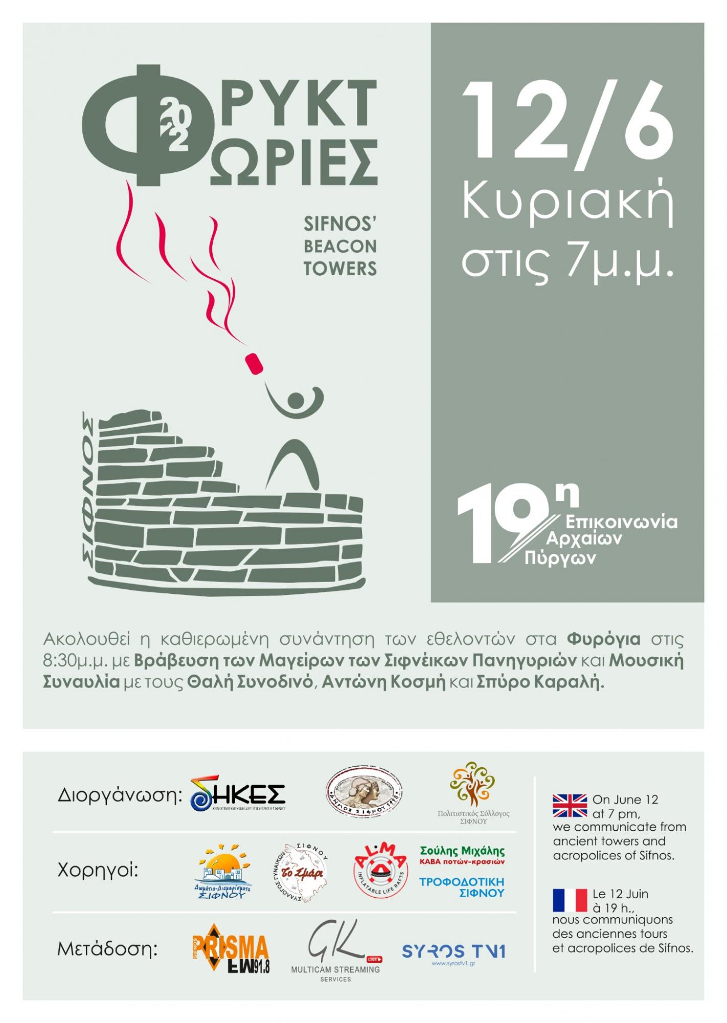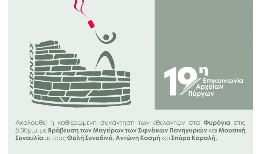 20 χρόνια μετά την πρώτη σύγχρονη επικοινωνία των Αρχαίων πύργων της Σίφνου και μετά από μια χρονιά αναγκαστικού "κλεισίματος", την Κυριακή 12 Ιουνίου 2022, ξαναδίνουμε ζωή στα απομεινάρια του αρχαιολογικού πλούτου της Σίφνου, με την 19η ετήσια επικοινωνία εκατοντάδων εθελοντών