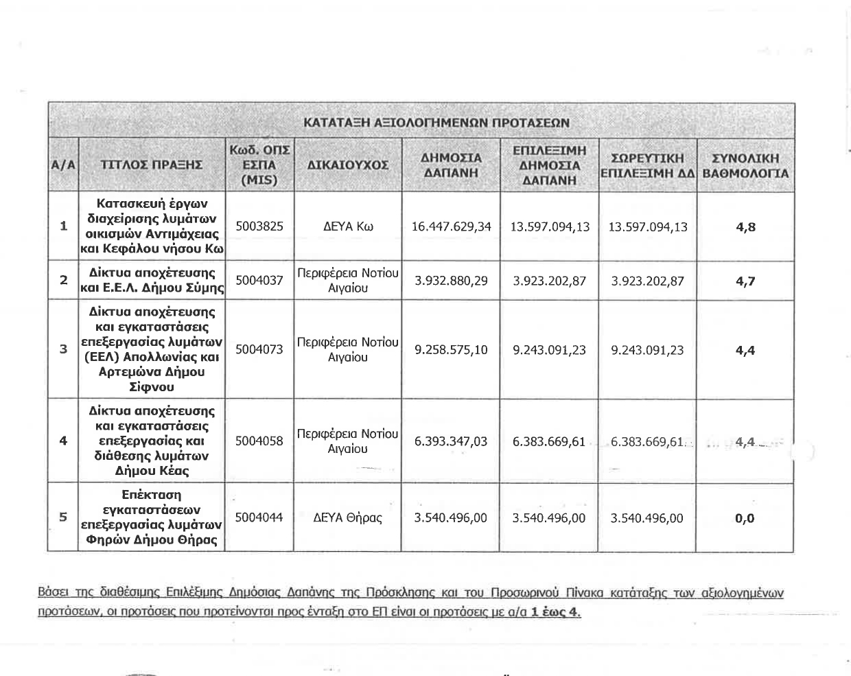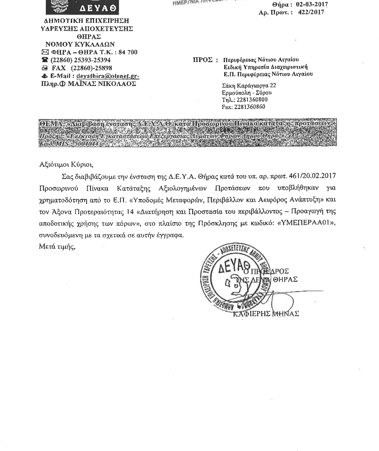 Το συγκεκριμένο έργο ήταν ενταγμένο στο περιφερειακό ΕΣΠΑ. Η πρόσκληση για συμμετοχή στο πρόγραμμα έγινε τον Οκτώβριο του 2016. Η ΔΕΥΑ Θήρας υπό τη διοίκηση του κ. Μηνά Καφιέρη, υπέβαλλε αίτημα ένταξης το οποίο δεν αξιολογήθηκε στον προσωρινό πίνακα αξιολόγησης στις 20/02/2017 με αποτέλεσμα να απορριφθεί. Εν συνεχεία η ΔΕΥΑΘ υπέβαλλε ένσταση στη Διαχειριστική Αρχή η οποία έγινε αποδεκτή, με αποτέλεσμα στον νέο πίνακα αξιολόγησης την 27/03/2017 (Α.Π. 865) να λάβει την πρώτη θέση με 8,7 βαθμούς. Το έργο δημοπρατήθηκε την 26/06/2018 (ΑΔΑ: 6ΖΥ8ΟΕΨΠ-Ρ65) και η σύμβαση υπεγράφη με τον εργολάβο την 21/12/2018. Ο συμβατικός χρόνος ολοκλήρωσης του έργου ήταν έως την 21/12/2020 σύμφωνα με τη σύμβαση.