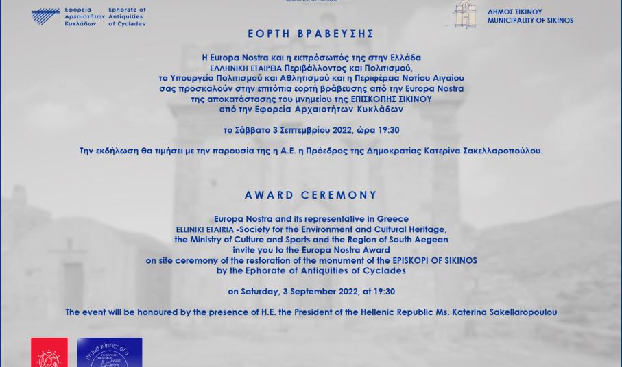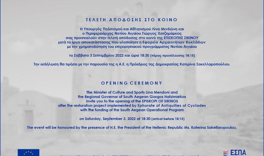 Η Υπουργός Πολιτισμού, Λίνα Μενδώνη θα παρευρεθεί στη Σίκινο, το Σάββατο, 3 Σεπτεμβρίου, στο πλαίσιο της τελετής για την απόδοση στην τοπική κοινωνία της Επισκοπής Σικίνου.
