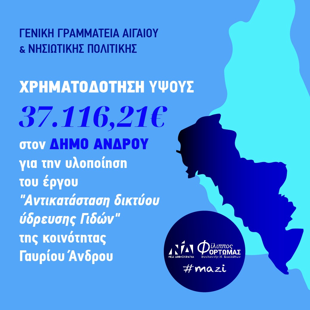 Την ικανοποίησή του εξέφρασε ο βουλευτής Κυκλάδων της Νέας Δημοκρατίας κ. Φίλιππος Φόρτωμας, για την απόφαση χρηματοδότησης του Δήμου Άνδρου μέχρι του συνολικού ποσού των 37.116,21€ με σκοπό την υλοποίηση του έργου "Αντικατάσταση δικτύου ύδρευσης Γιδών" της κοινότητας Γαυρίου Άνδρου, η οποία υπεγράφη από τον Υπουργό Ναυτιλίας και Νησιωτικής Πολιτικής, σε συνεργασία με τη Γενική Γραμματεία Αιγαίου και Νησιωτικής Πολιτικής. Η δαπάνη εντάσσεται στο πλαίσιο του έργου «Υδροδότηση άνυδρων νησιών & έργα βελτίωσης υποδομών ύδρευσης των νησιών» του Προγράμματος Δημοσίων Επενδύσεων (ΠΔΕ) έτους 2022.