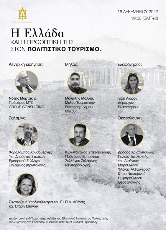 Το πολιτιστικό αποτύπωμα της Ελαφονήσου, της Μήλου και της Σαλαμίνας καθώς και οι αθλητικές διοργανώσεις του Μαραθωνίου "Μέγας Αλέξανδρος" και του Νυκτερινού Ημιμαραθωνίου Θεσσαλονίκης παρουσιάστηκαν σε διαδικτυακή εκδήλωση που οργάνωσε την περασμένη Παρασκευή το