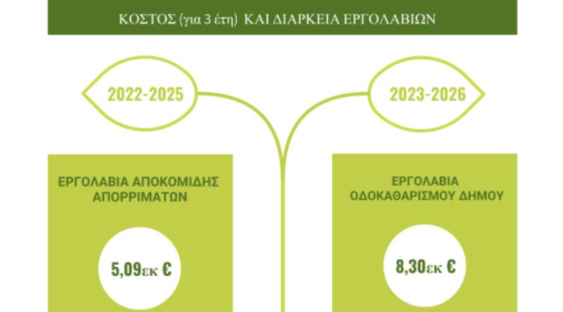 Η νέα εργολαβία καθαριότητας που έχει αντικείμενο τον οδοκαθαρισμό και την αποκομιδή ογκωδών αντικειμένων θα έχει διάρκεια 2 + 1 έτη δηλαδή από το 2023 έως το 2025.  Το κόστος της υπολογίστηκε σε 2.777.395,80€ για κάθε έτος, και συνολικά μέχρι τη λήξη της υπολογίζεται να δαπανηθούν 8,3εκ ευρώ. Θα περιλαμβάνει τον οδοκαθαρισμό με 28 εργάτες συν 8 επιπλέον την καλοκαιρινή περίοδο, την αποκομιδή των ογκωδών αντικειμένων και την αποκομιδή απορριμμάτων με υποζύγια.