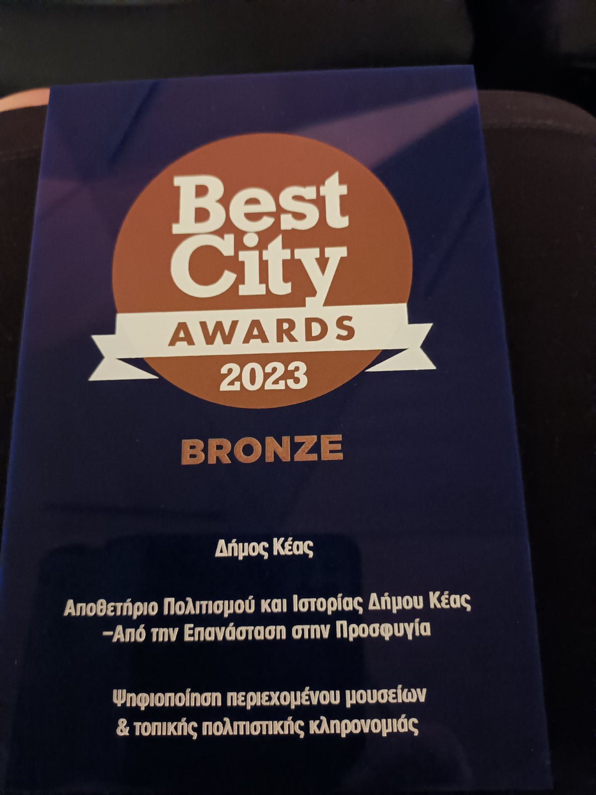 Ο Δήμος Κέας βραβεύτηκε στη διοργάνωση BEST CITY AWARDS στην κατηγορία “Πολιτισμός & Τουρισμός”, στον Τομέα “Ψηφιοποίηση περιεχομένου μουσείων & τοπικής πολιτιστικής κληρονομιάς”. Το Ψηφιακό Αποθετήριο του Δήμου Κέας κέρδισε τις εντυπώσεις και κατάφερε να φέρει στην Κέα μία βράβευση. Η Βράβευση έγινε στον Πολυχώρο στο Γκάζι, παρουσία του Υπουργού Εσωτερικών κ. Βορίδη, του προέδρου της ΚΕΔΕ και πολλών Δημάρχων από όλη την Ελλάδα.