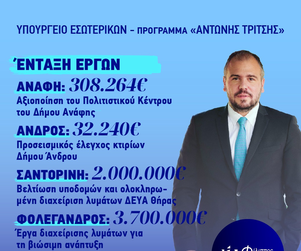 Την ένταξη τεσσάρων μεγάλων έργων στα νησιά της Ανάφης, της Άνδρου, της Σαντορίνης και της Φολεγάνδρου, μέσα από το πρόγραμμα"Αντώνης Τρίτσης", ανακοίνωσε σήμερα το Υπουργείο Εσωτερικών.