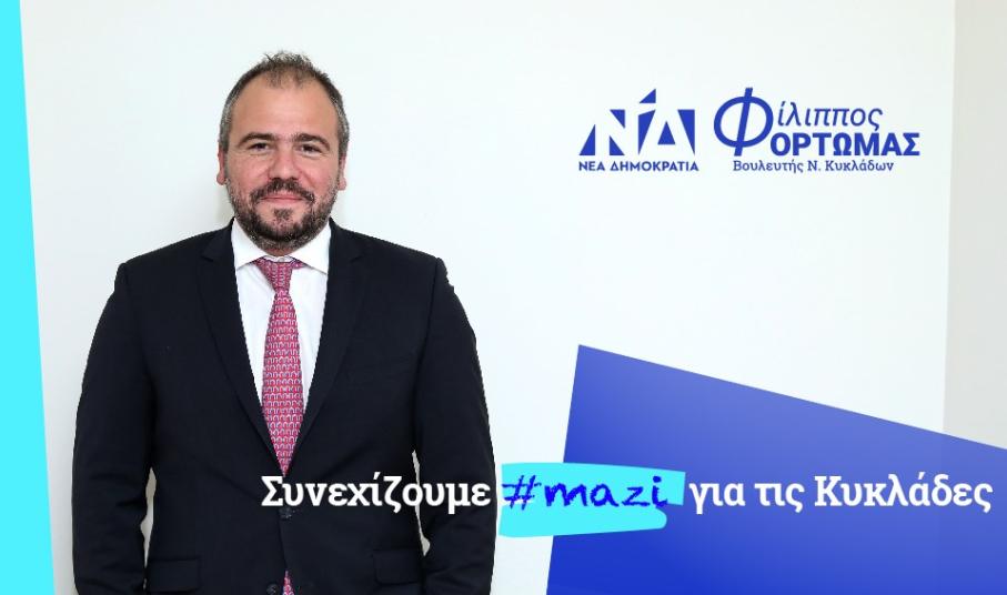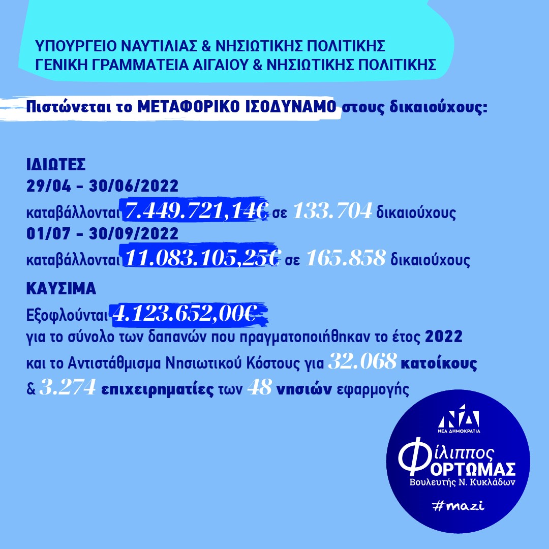 Ο βουλευτής Κυκλάδων της Νέας Δημοκρατίας, κ. Φίλιππος Φόρτωμας, εκφράζει την ικανοποίηση του για την έγκριση των πιστώσεων του Μεταφορικού Ισοδυνάμου από το Υπουργείο Ανάπτυξης και Υποδομών προς το Υπουργείο Ναυτιλίας και Νησιωτικής Πολιτικής, καθώς προωθείται από τις 24/4/2023 η πληρωμή του στους δικαιούχους επιβάτες, για καύσιμα και επιχειρήσεις, συνολικού ύψους 40.000.000,00 ευρώ, για το διάστημα έως και 30/09/2022.