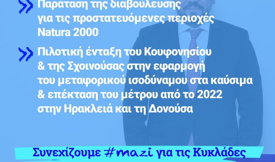 -Την πιλοτική ένταξη του Κουφονησίου και της Σχοινούσας στην εφαρμογή του μεταφορικού ισοδύναμου στα καύσιμα και την επέκταση από το 2022 του μέτρου στην Ηρακλειά και τη Δονούσα