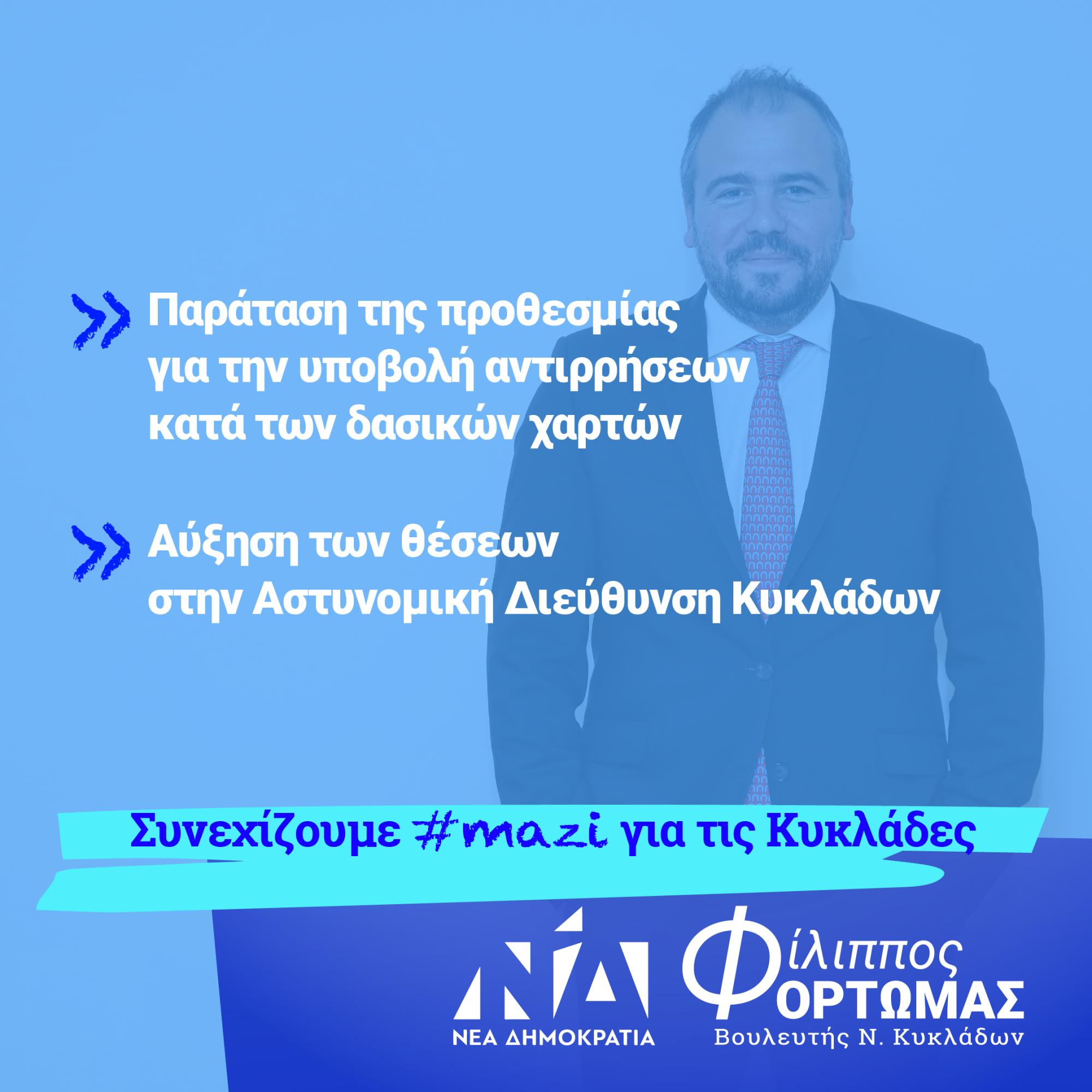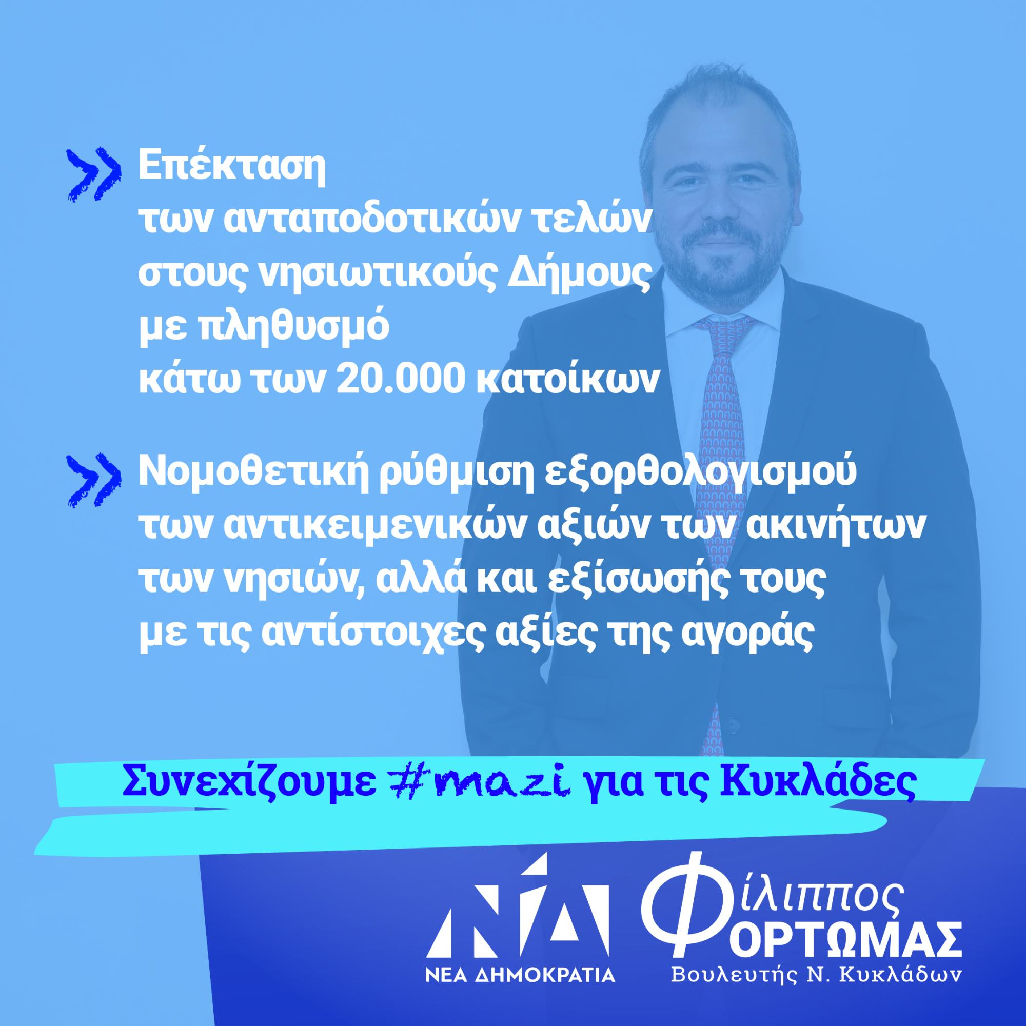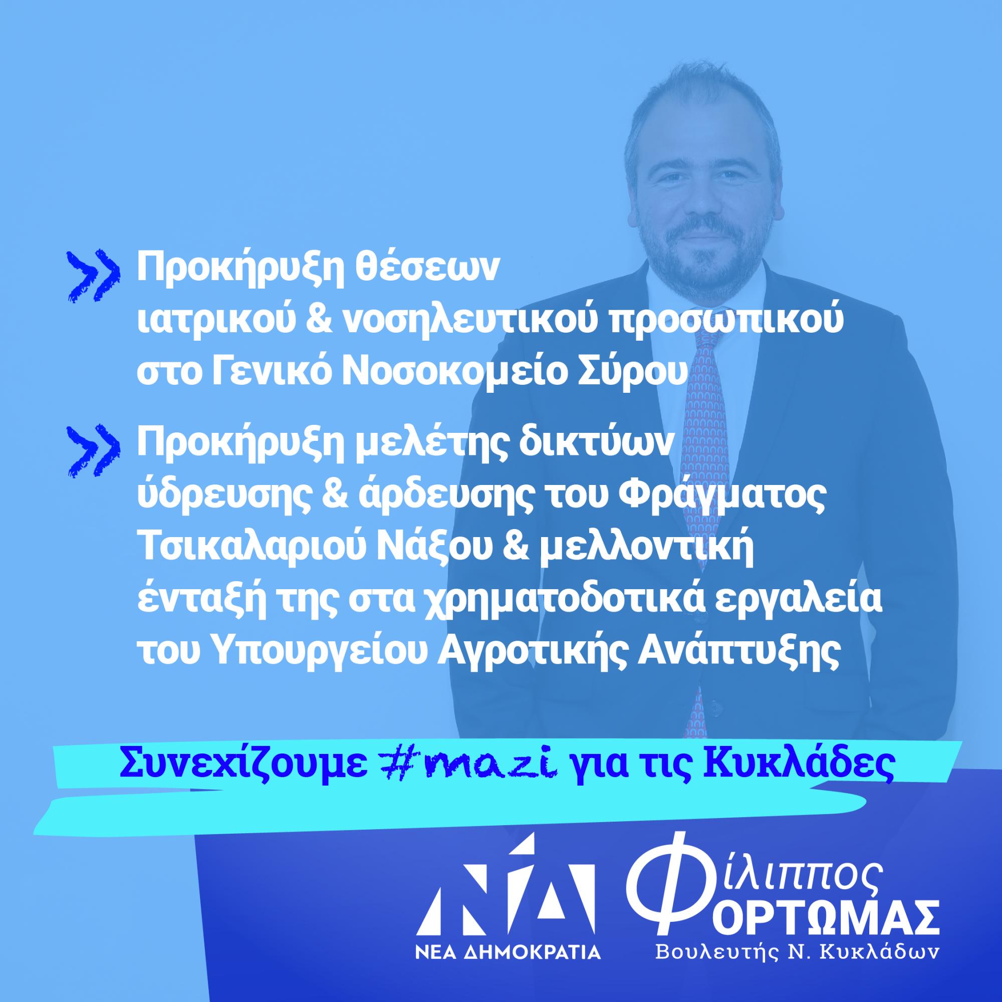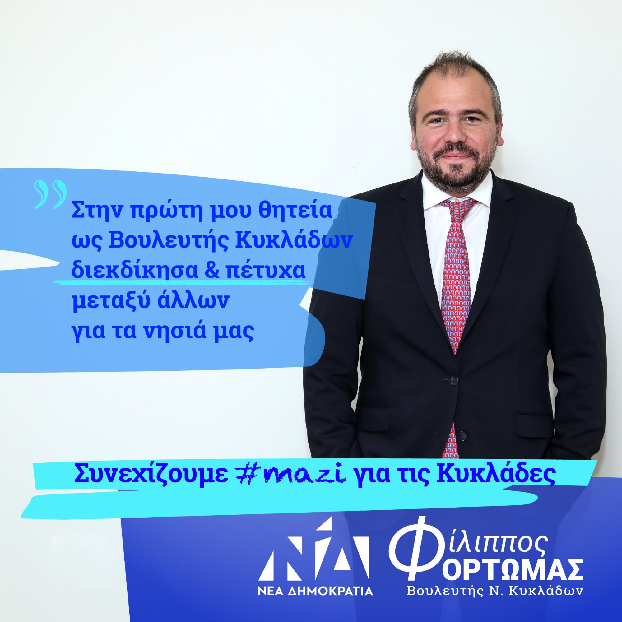 Με την ολοκλήρωση της κοινοβουλευτικής θητείας της απερχόμενης Βουλής, ο Βουλευτής Κυκλάδων, κ. Φίλιππος Φόρτωμας, κάνοντας έναν προσωπικό απολογισμό της τετραετούς δράσης του, διέκρινε τα σημαντικότερα από αυτά που διεκδίκησε και πέτυχε πρόσφατα για τις Κυκλάδες: