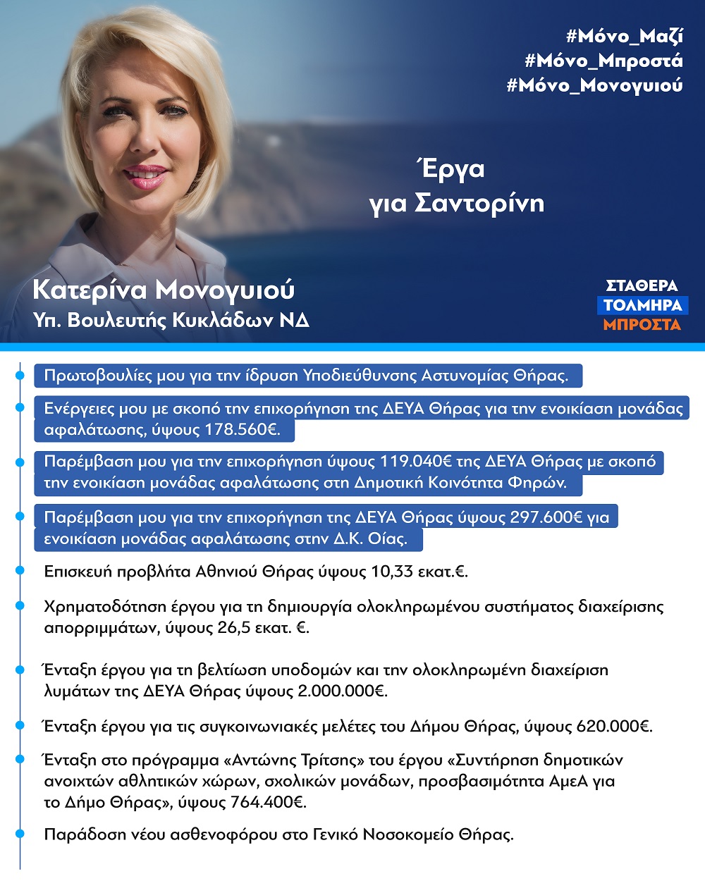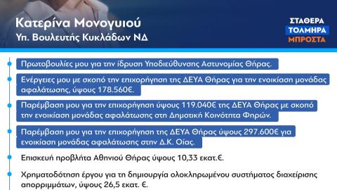 Το παρόν έδωσε και ο Υφυπουργός Προστασίας του Πολίτη κ. Λευτέρης Οικονόμου, ο οποίος συνέβαλλε καθοριστικά και αποφασιστικά στη δημιουργία της Υποδιεύθυνσης Αστυνομίας Σαντορίνης και στην πάταξη της εγκληματικότητας στο νησί. Σε συνεργασία με τους Δημάρχους, η Κατερίνα Μονογυιού πρωτοστάτησε στη δημιουργία των Υποδιευθύνσεων Αστυνομίας στη Μύκονο και τη Σαντορίνη. Παράλληλα, το διάστημα 2019-2023 η Κατερίνα Μονογυιού έκανε μία σειρά παρεμβάσεων με σκοπό την παροχή επιχορηγήσεων στην ΔΕΥΑ Θήρας με σκοπό τις ενοικιάσεις μονάδων αφαλάτωσης στη Θήρα, στις δημοτικές κοινότητες Φηρών και Οίας, συνολικού ύψους 595.200 ευρώ. Παράλληλα, το ίδιο διάστημα πραγματοποίησε μία σειρά συναντήσεων με τον Υπουργό Ναυτιλίας και Νησιωτικής Πολιτικής κ. Γιάννη Πλακιωτάκη και τον Γενικό Γραμματέα Λιμένων, Λιμενικής Πολιτικής και Ναυτιλιακών Επενδύσεων κ. Ευάγγελο Κυριαζόπουλο με σκοπό την ολοκλήρωση του νέου λιμανιού της Σαντορίνης, το οποίο θα συμβάλει καθοριστικά στην καλύτερη εξυπηρέτηση και στην μεγαλύτερη ασφάλεια των νησιωτών και των τουριστών.