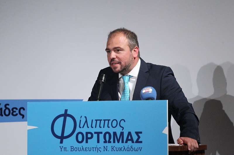 Ο  κ. Φόρτωμας ανεβαίνοντας στο βήμα, ευχαρίστησε όλους τους παρευρισκόμενους για τη θερμή υποδοχή που του επεφύλαξαν και την παρουσία τους στην εκδήλωση και ξεκινώντας την ομιλία του έκανε αναφορά στο έργο που έχει επιτελέσει η Κυβέρνηση της Νέας Δημοκρατίας καθ΄όλη τη δύσκολη τετραετία, εστιάζοντας στις διαδοχικές κρίσεις που ο Πρωθυπουργός Κυριάκος Μητσοτάκης αντιμετώπισε με συγκεκριμένη στρατηγική, με επιμονή και κυρίως λέγοντας πάντα και μόνο την αλήθεια στον ελληνικό λαό, χωρίς να υπολογίζει το κόστος. Πιο συγκεκριμένα ο υ. βουλευτής Κυκλάδων ανέφερε «ο Κυριάκος Μητσοτάκης έδειξε πως διαθέτει τα αντανακλαστικά αυτά και τη στόφα του μεγάλου ηγέτη που είχαμε χρόνια να δούμε στην ελληνική πολιτική σκηνή. Και που ήρθε πραγματικά την πιο κρίσιμη στιγμή για τη χώρα!», ενώ συμπλήρωσε: «Η Κυβέρνηση της Νέας Δημοκρατίας έδωσε εθνική υπόσταση στον όρο νησιωτικότητα! Ο νησιώτης Κυριάκος Μητσοτάκης τίμησε τη θέση, τις ιδιαιτερότητες και τις προκλήσεις που αντιμετωπίζουμε  όλοι μας οι Κυκλαδίτες και οι Κυκλαδίτισσες!».