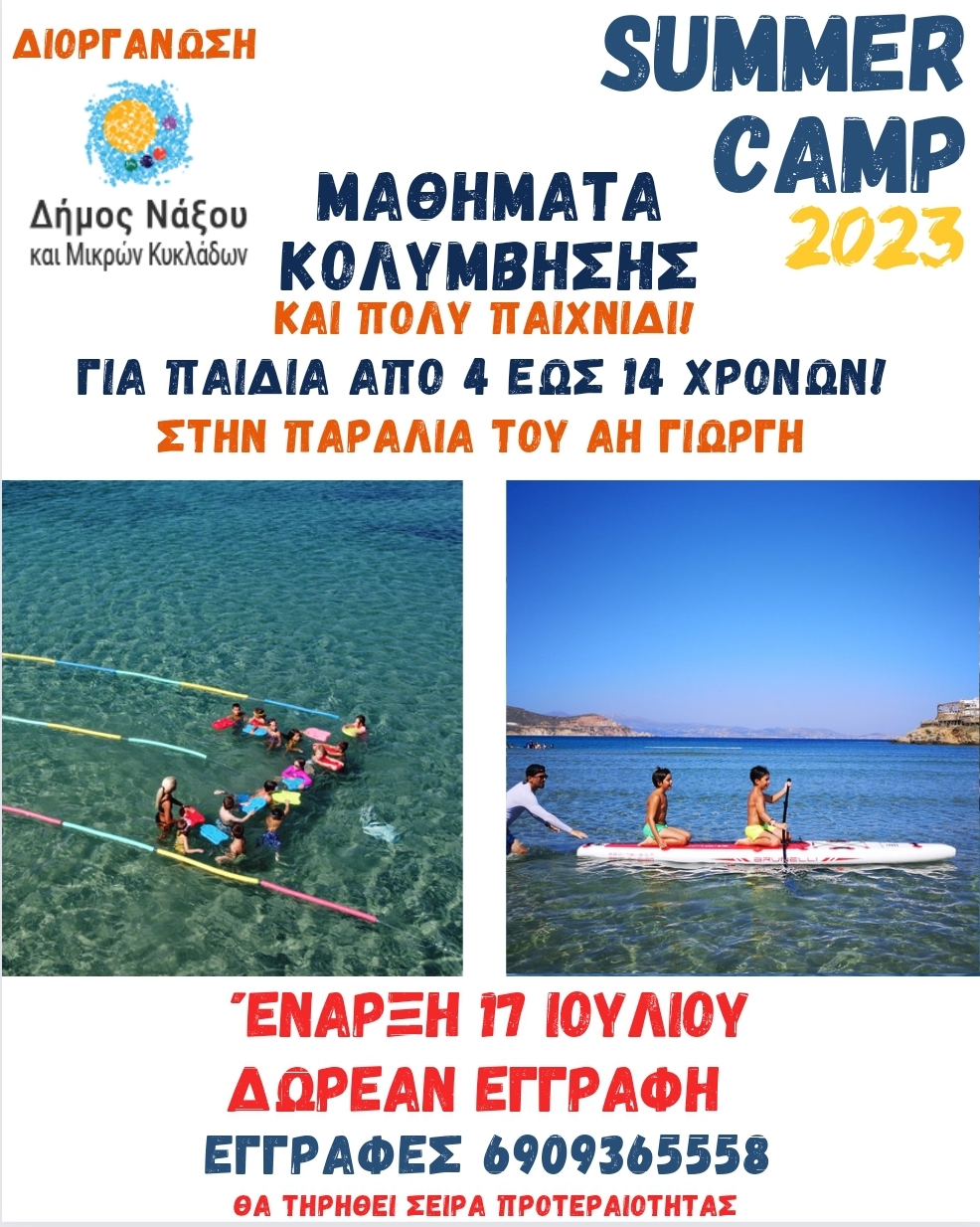 O Δήμος Νάξου και Μικρών Κυκλάδων διοργανώνει για μία ακόμα χρονιά δωρεάν καλοκαιρινό Camp για παιδιά από 4 έως 14 ετών. Από τη Δευτέρα 17 Ιουλίου και για δύο εβδομάδες, τα παιδιά θα έχουν τη δυνατότητα άθλησης και παιχνιδιού, με μαθήματα κολύμβησης και άλλες δράσεις.