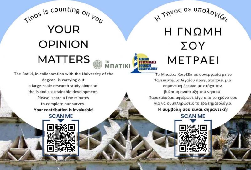 Μία σημαντική πρωτοβουλία, με φόντο την βιώσιμη ανάπτυξη, εξελίσσεται στην Τήνο, η οποία προκύπτει από τη συνεργασία του εργαστηρίου Τοπικής Νησιωτικής Ανάπτυξης του Πανεπιστημίου Αιγαίου και της Κοι.Ν.Σεπ. το “Μπατίκι”, οι οποίοι οργάνωσαν την πρωτοβουλία και καλούν τον κόσμο να πει τη γνώμη του, αναφέροντας, τον γενικό τίτλο: "Η Τήνος σε υπολογίζει, η γνώμη σου μετράει".