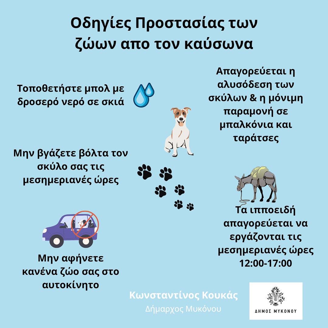 Ο καύσωνας βρίσκεται στο αποκορύφωμά του και στον Δήμο Μυκόνου, αντιλαμβάνονται ότι ανάγκη από προστασία δεν έχουν μόνο οι άνθρωποι αλλά και τα αδέσποτα ζώα του νησιού. Σε σημερινή του ανακοίνωση ο δήμαρχος του νησιού, Κωνσταντίνος Κουκάς, έκανε γνωστές στον κόσμο τις οδηγίες προστασίας των αδέσποτων ζώων και των ζώων συντροφιάς.