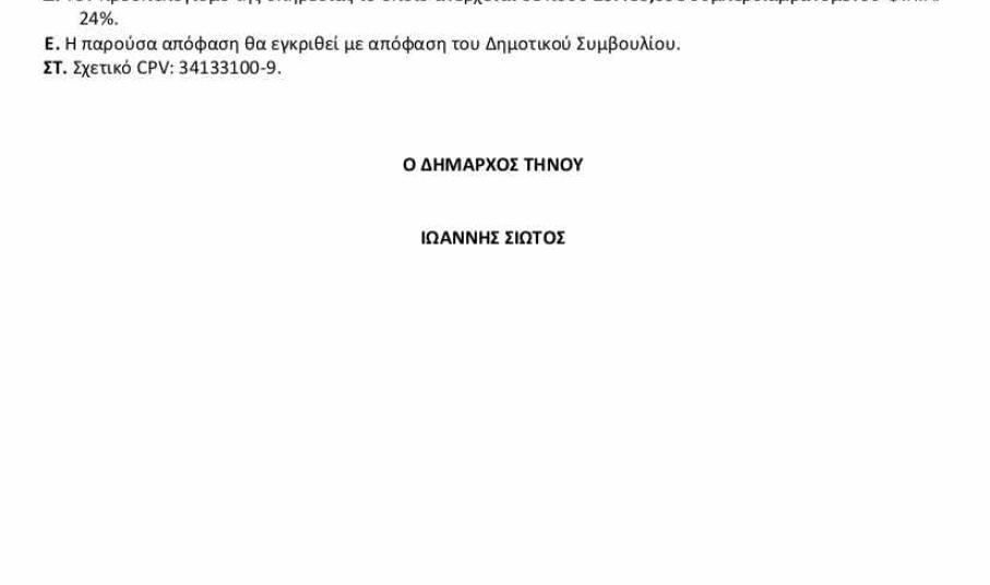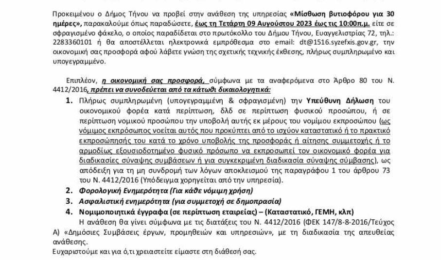 Με μια πρόσκληση για υποβολή προσφοράς που δημοσιεύτηκε στις 8/8/2023 και έληξε στις 9/8/2023 και ώρα 10.00 το πρωί, ο Δήμαρχος Τήνου, έλαβε προσφορά και ανέθεσε απευθείας την μίσθωση ενός βυτιοφόρου για τριάντα (30) ημέρες, με κόστος 20.460,00€, δηλαδή με 680€ την ημέρα! Ενδεικτικά, μπορεί πολύ εύκολα να βρει κανείς στο διαδίκτυο, ανάλογο μοντέλο βυτιοφόρου να ενοικιάζεται για 2 χρόνια, με λιγότερο από 1.000€ ανά μήνα (συνολικό κόστος ~18200€).
