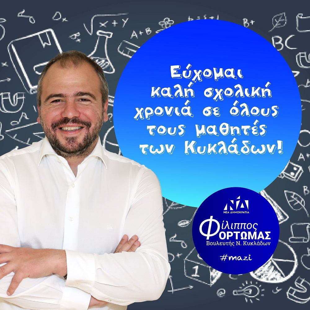 Με αφορμή την έναρξη της νέας σχολικής χρονιάς, ο βουλευτής Κυκλάδων κ. Φίλιππος Φόρτωμας έκανε την ακόλουθη δήλωση: «Σε όλους τους μαθητές των Κυκλάδων, στους γονείς τους και στην πολύτιμη εκπαιδευτική κοινότητα των νησιών μας, εύχομαι ολόψυχα καλή αρχή, καλή σχολική χρόνια με δύναμη, πολλή γνώση και πολλές επιτυχίες. Τα παιδιά μας είναι η περηφάνια μας και ο κύριος λόγος για να δίνουμε μάχες για το μέλλον. Το μέλλον που τους αξίζει να ζήσουν, να δημιουργήσουν. Το μέλλον που ονειρεύονται!»