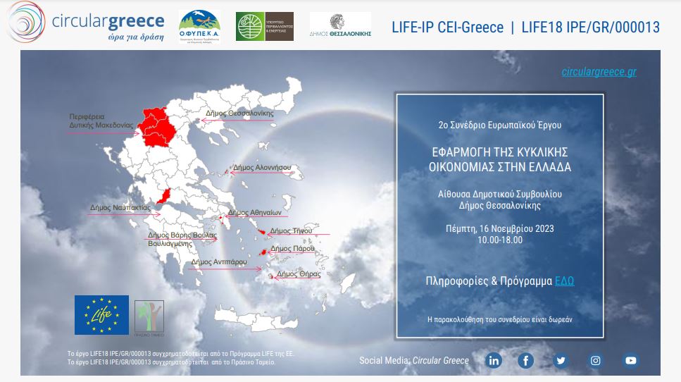 Ισχυρή εκπροσώπηση θα έχουν οι Κυκλάδες στο νέο συνέδριο με θέμα την Κυκλική Οικονομία. Το Υπουργείο Περιβάλλοντος και Ενέργειας σε συνεργασία με τον Οργανισμό Φυσικού Περιβάλλοντος και Κλιματικής Αλλαγής και τον Δήμο Θεσσαλονίκης, διοργανώνει το 2ο συνέδριο του ευρωπαϊκού έργου LIFE-IP CEI-Greece με τίτλο «Εφαρμογή της Κυκλικής Οικονομίας στην Ελλάδα», το οποίο θα διεξαχθεί την Πέμπτη, 16 Νοεμβρίου 2023 και ώρα 10.00 π.μ. – 17.30 μ.μ. στη Θεσσαλονίκη, στην αίθουσα Δημοτικού Συμβουλίου του Δήμου Θεσσαλονίκης.