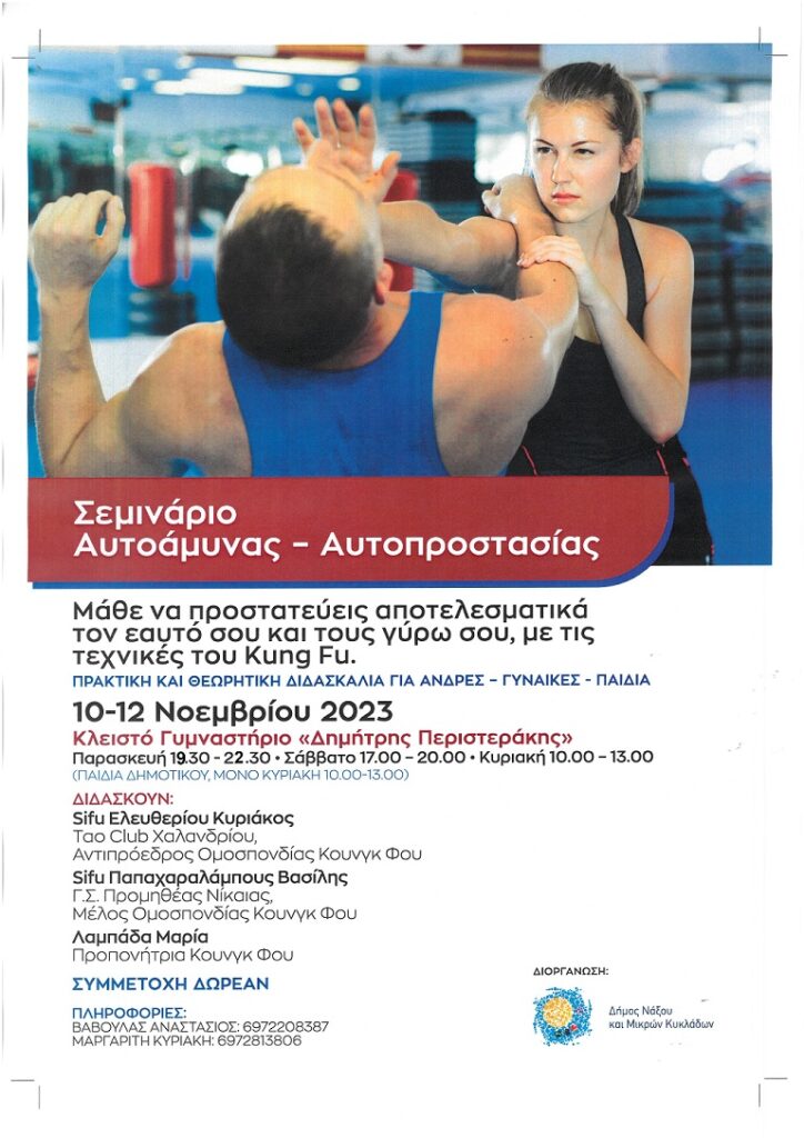 Δωρεάν σεμινάρια αυτοάμυνας-αυτοπροστασίας, διοργανώνει το τριήμερο 10-12 Νοεμβρίου, ο Δήμος Νάξου και Μικρών Κυκλάδων.