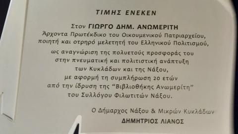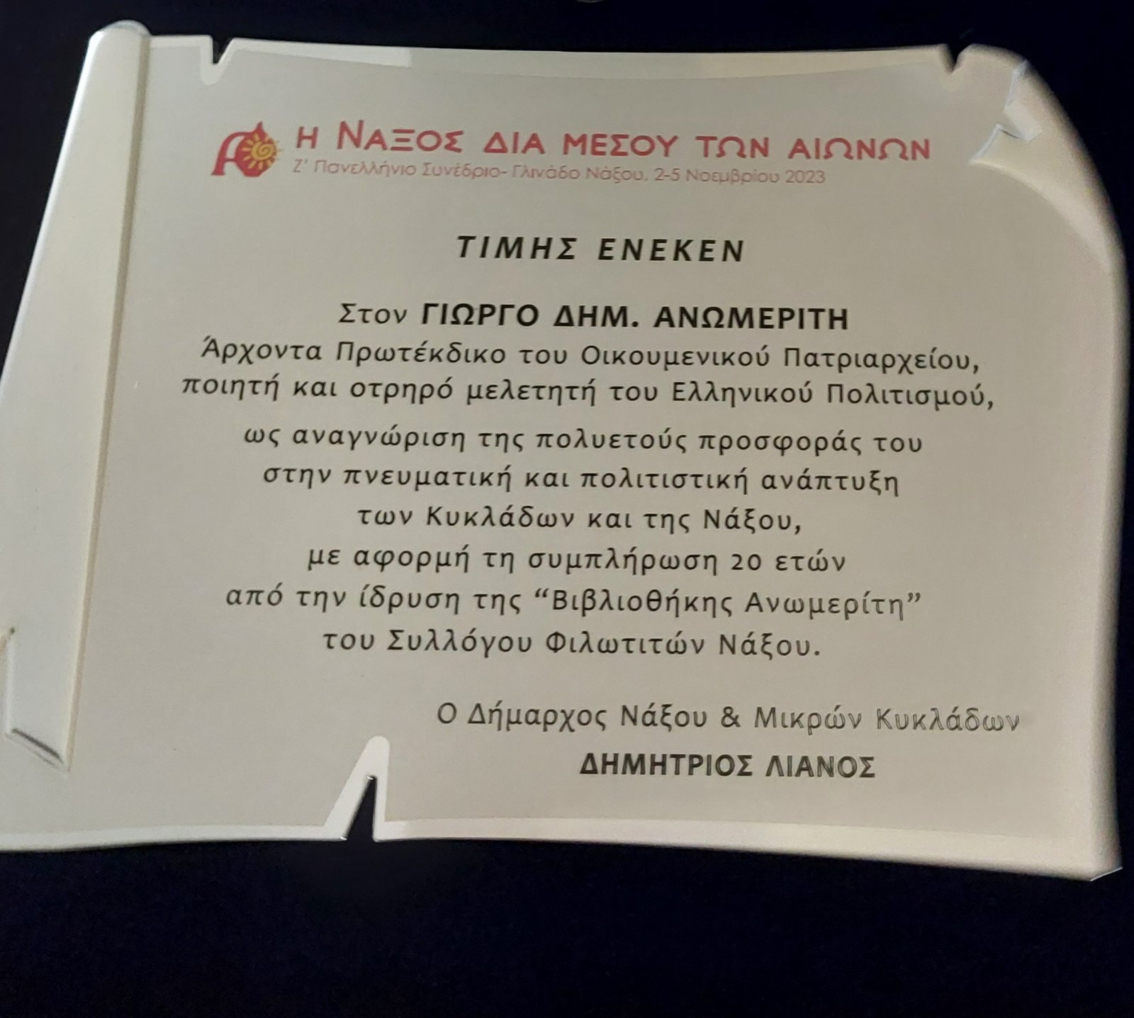 Με αφορμή την ανάδειξη του κ. Γιώργου Ανωμερίτη ως τιμώμενου προσώπου του Ζ΄ Συνεδρίου “Η Νάξος δια μέσου των αιώνων”, ο Δήμαρχος Νάξου και Μικρών Κυκλάδων κ. Δημήτρης Λιανός παρέδωσε τιμητική πλακέτα στον κ. Γ. Ανωμερίτη “ως αναγνώριση της πολυετούς προσφοράς του στην πνευματική και πολιτιστική ανάπτυξη των Κυκλάδων και της Νάξου με αφορμή την συμπλήρωση 20 ετών από την ίδρυση της “Βιβλιοθήκης Ανωμερίτη” του Σ.Φ.Ν.”