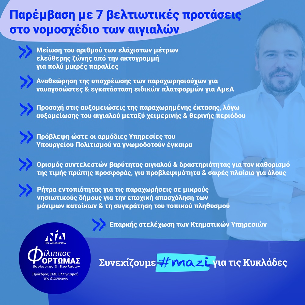 Συγκεκριμένα, ο βουλευτής ανέφερε, καταρχάς, την ανάγκη να υπάρξει μέριμνα για μείωση του αριθμού των ελάχιστων μέτρων ελεύθερης ζώνης από την ακτογραμμή ειδικά για πολύ μικρές παραλίες, οι οποίες υπάρχουν σε μεγάλο αριθμό στις Κυκλάδες.