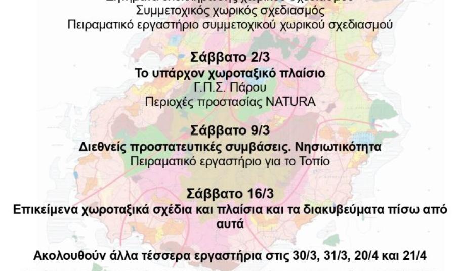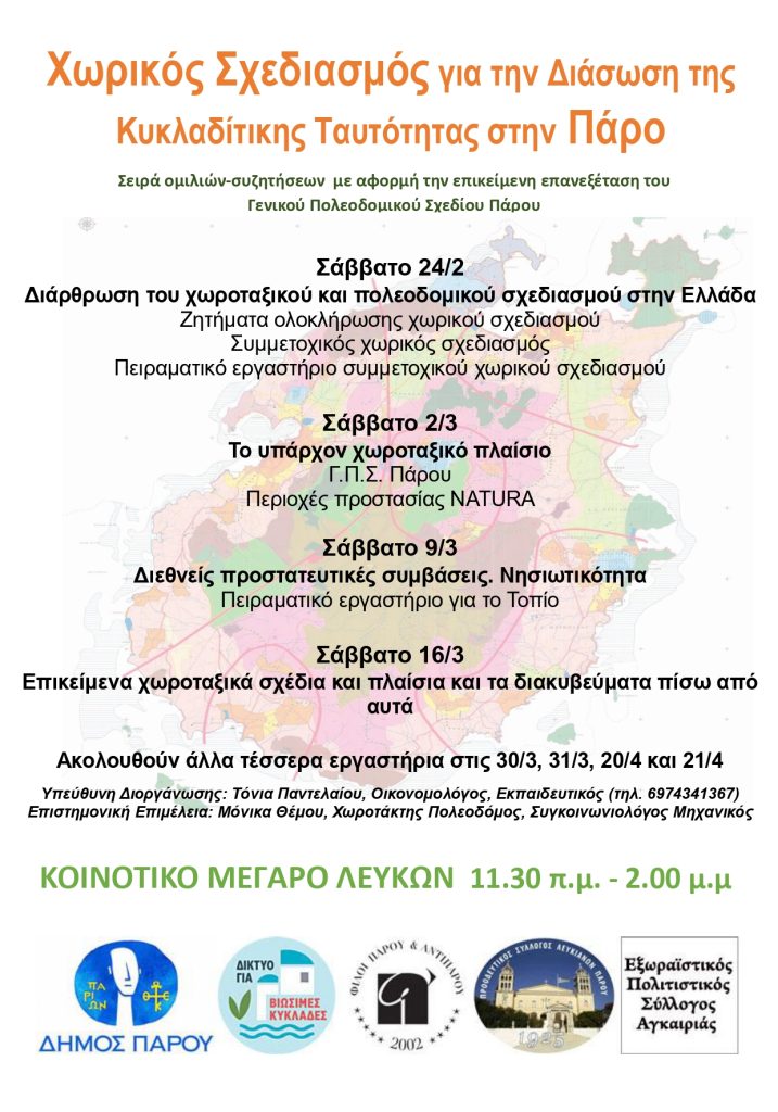 Μία σειρά εργαστηριών που αφορούν στον Χωροταξικό Σχεδιασμό για τη διάσωση της κυκλαδίτικης ταυτότητας, πραγματοποιούνται το τελευταίο διάστημα στην Πάρο. Tα εργαστήρια διοργανώνονται από τον Δήμο Πάρου, το Δίκτυο Βιώσιμων Κυκλάδων και τους Συλλόγους "Φίλοι Πάρου και Αντιπάρου", Εξωραϊστικός και Πολιτιστικός Σύλλογος Αγκαιριάς, Μ.Ε.Ε.Α.Σ. Υρια Λευκών. Σκοπός είναι η ενεργή συμμετοχή των πολιτών, στον σχεδιασμό που θα φέρει μία νέα εικόνα στην Πάρο.