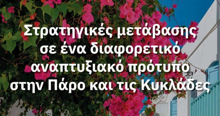Σε αυτή τη συγκυρία φορείς της Πάρου αποφάσισαν τη διοργάνωση μιας διημερίδας στις 13 και 14 Απριλίου 2024 με τίτλο «Στρατηγικές μετάβασης σε ένα διαφορετικό πρότυπο ανάπτυξης στην Πάρο και τις Κυκλάδες». Όπως αναφέρουν σε κοινή τοποθέτηση τους, σκοπός τους είναι να προχωρήσουν με τη βοήθεια εξειδικευμένων επιστημόνων και ανθρώπων με γνώση του χώρου πέρα από τις γενικές διαπιστώσεις και κατευθύνσεις που χαρακτηρίζουν τις περισσότερες μέχρι σήμερα προσπάθειες στη χάραξη ενός συγκεκριμένου οδικού χάρτη μετάβασης προς ένα αναπτυξιακό πρότυπο που θα εξισορροπήσει την οικονομική ανάπτυξη με την προστασία του περιβάλλοντος και της φυσιογνωμίας και την κοινωνική συνοχή.
