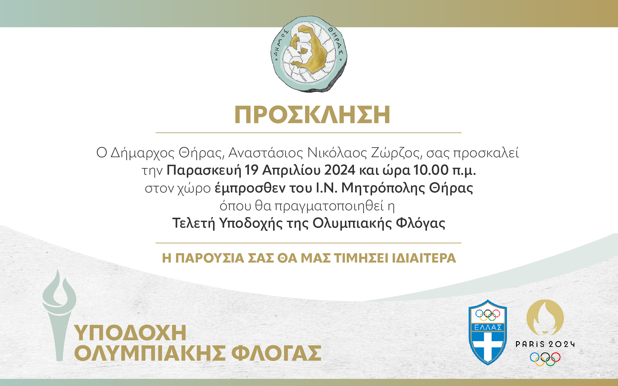 Ο Δήμαρχος Θήρας, Αναστάσιος Νικόλαος Ζώρζος, σας προσκαλεί την Παρασκευή 19 Απριλίου 2024 και ώρα 10:00 π.μ. στον χώρο έμπροσθεν του Ι.Ν. Μητρόπολης Θήρας όπου θα πραγματοποιηθεί η Τελετή Υποδοχής της Ολυμπιακής Φλόγας.