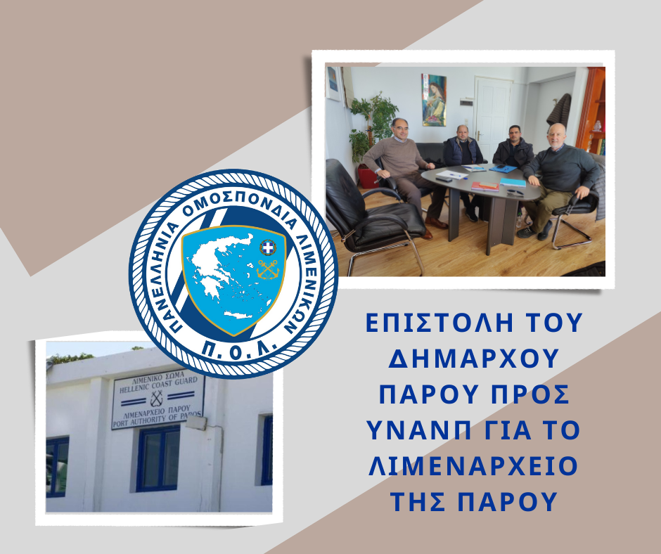 Σε συνέχεια της επίσκεψης της Πανελλήνιας Ομοσπονδίας Λιμενικών και της Ένωσης Λιμενικών Νοτιοανατολικού Αιγαίου στη Λιμενική Αρχή της Πάρου (εδώ) αλλά και της συνάντησής μας με τον Δήμαρχο κ. Κώστας Μπιζά αλλά και τον Πρόεδρο του λιμενικού ταμείου Πάρου κ. Αλέξη Γκόκα όπου και αναδείχτηκαν τα προβλήματα υποστελέχωσης καθώς και άλλα θέματα που αντιμετωπίζουν οι υπηρετούντες στο Λ/Χ Πάρου (εδώ) , ακολούθησε η επιστολή του Δημάρχου Πάρου (εδώ) προς το ΥΝΑΝΠ και συγκεκριμένα προς τον Υπουργό Ναυτιλίας και Νησιωτικής Πολιτικής κ. Στυλιανίδη Χρήστο η οποία επιβεβαιώνει δυστυχώς την δεινή θέση στην οποία βρίσκονται τα στελέχη που Υπηρετούν στις Κυκλάδες.