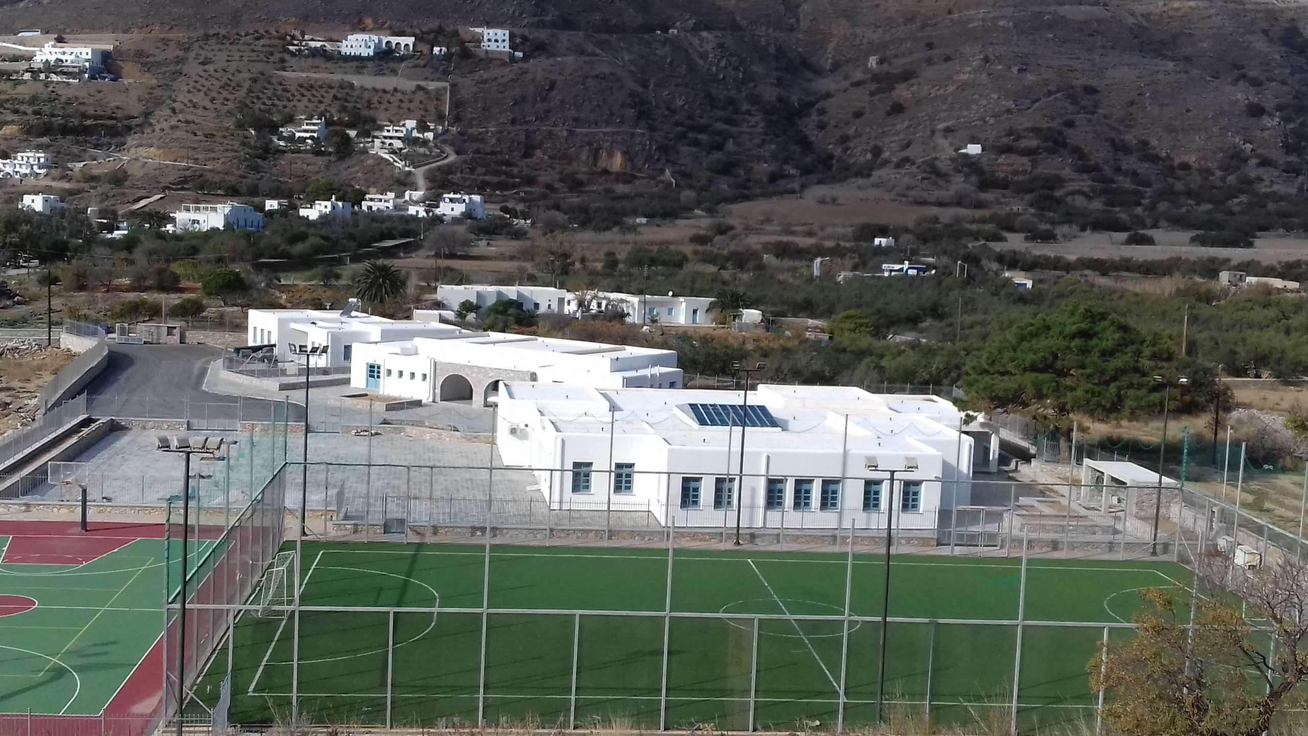 1) Το γήπεδο μπάσκετ και το γήπεδο ποδοσφαίρου και το γήπεδο βόλεϊ στην Χώρα.