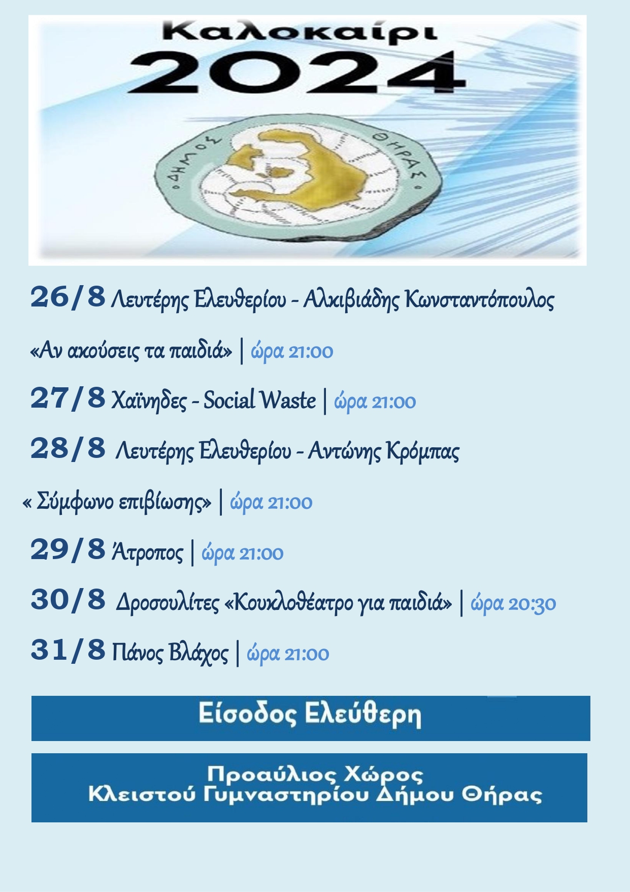Από τη Δευτέρα 26 Αυγούστου 2024 και κάθε μέρα μέχρι το Σάββατο 31 Αυγούστου 2024 ο Προαύλιος Χώρος του Κλειστού Γυμναστηρίου Δήμου Θήρας θα φιλοξενήσει πλήθος εκδηλώσεων.