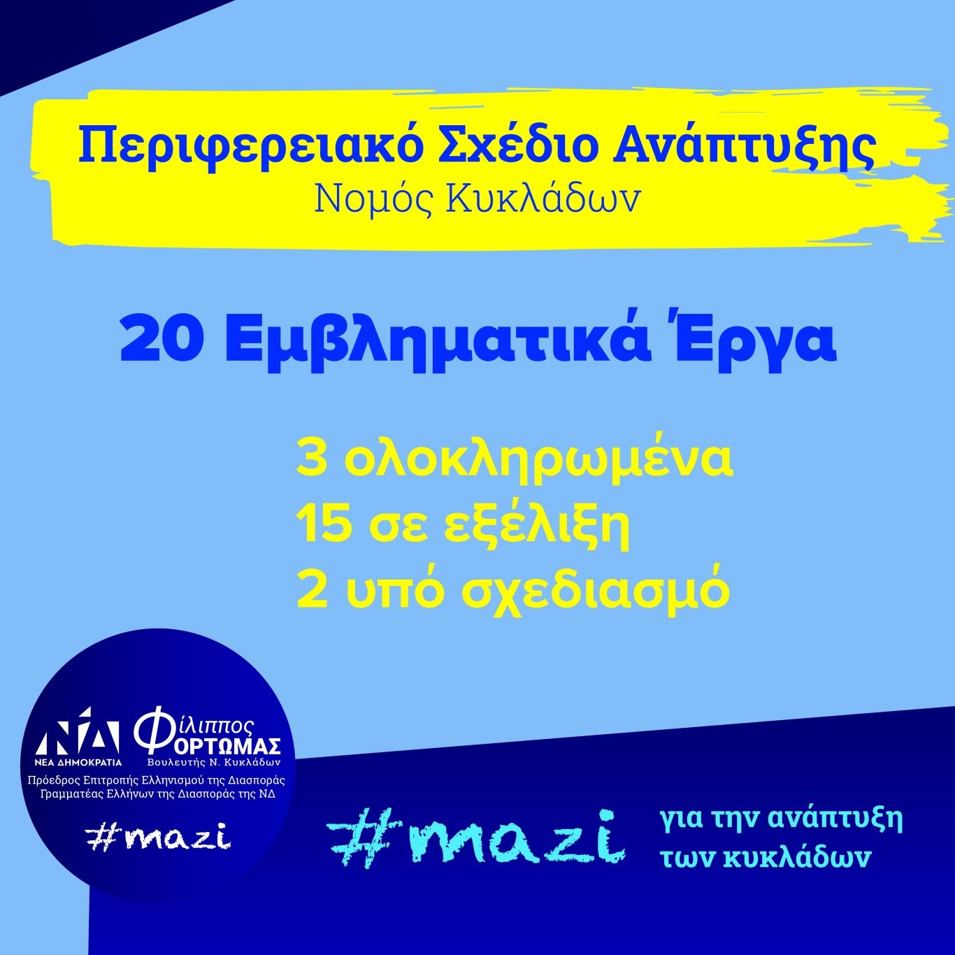 “Πιστοί στη δέσμευση μας, η Κυβέρνηση της Νέας Δημοκρατίας και ο Πρωθυπουργός Κυριάκος Μητσοτάκης, μέσα από την ψηφιακή πλατφόρμα για τα περιφερειακά σχέδια ανάπτυξης erga.gov.gr δίνει τη δυνατότητα σε κάθε πολίτη να έχει άμεση ενημέρωση για την εξέλιξη όλων των έργων σε όλη την Ελλάδα. Στο Νομό Κυκλάδων 20 εμβληματικά έργα που είτε έχουν ολοκληρωθεί, είτε είναι σε εξέλιξη, είτε σε στάδιο σχεδιασμού, θα βελτιώσουν την ποιότητα ζωής μας, προσφέροντάς στους συμπολίτες μας την ασφάλεια που δικαιούνται. “ δήλωσε ο κ. Φόρτωμας στη συνέχεια των ανακοινώσεων του Πρωθυπουργού για τη δημιουργία της ψηφιακής πλατφόρμας.