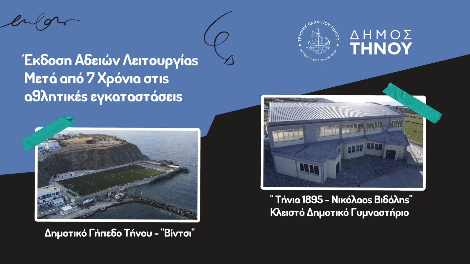 Μετά από σωρεία γραφειοκρατικών συνθηκών και από πίεση που άσκησε προσωπικά ο Δήμαρχος Τήνου Παναγιώτης Κροντηράς δύο σοβαρές αθλητικές εγκαταστάσεις στο νησί μας απέκτησαν άδεια λειτουργίας. Μετά από 7 συνεχόμενα χρόνια και κάτω από μεγάλη προσπάθεια του εντεταλμένου Συμβούλου Αθλητισμού Ιωάννη Μέγκουλα φτάσαμε αισίως στην έκδοση άδειας λειτουργίας τόσο του Κλειστού Γυμναστηρίου ” Τήνια 1896 – Νικόλαος Βιδάλης , όσο και του Αθλητικού Γυμναστηρίου ” Βίντσι”.