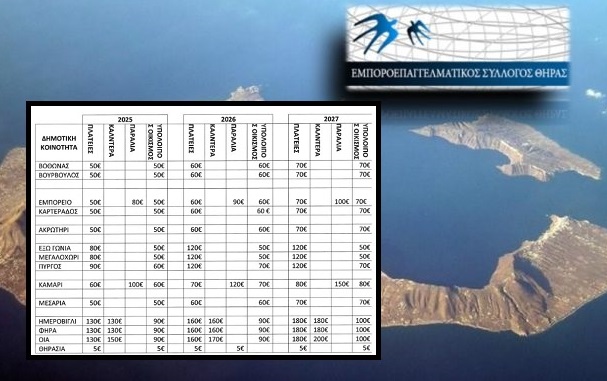 "Με την παρούσα επιστολή, επιθυμούμε να σας ενημερώσουμε για την απόφαση του Δήμου Θήρας να προχωρήσει στη συγκεκριμένη αναπροσαρμογή των τελών για τη χρήση κοινόχρηστων χώρων για τα έτη 2025-2027. Από το 2012 έως σήμερα, το τέλος παρέμενε σταθερό, παρά τις σημαντικές αλλαγές στις κοινωνικές, οικονομικές και αναπτυξιακές συνθήκες που έχουν διαμορφώσει μια νέα πραγματικότητα στο νησί μας. Η Σαντορίνη πλέον αποτελεί έναν κορυφαίο διεθνή τουριστικό προορισμό, με αυξημένες ανάγκες διαχείρισης κοινόχρηστων υποδομών, βελτίωσης υπηρεσιών και διασφάλισης της ποιότητας του δημόσιου χώρου.