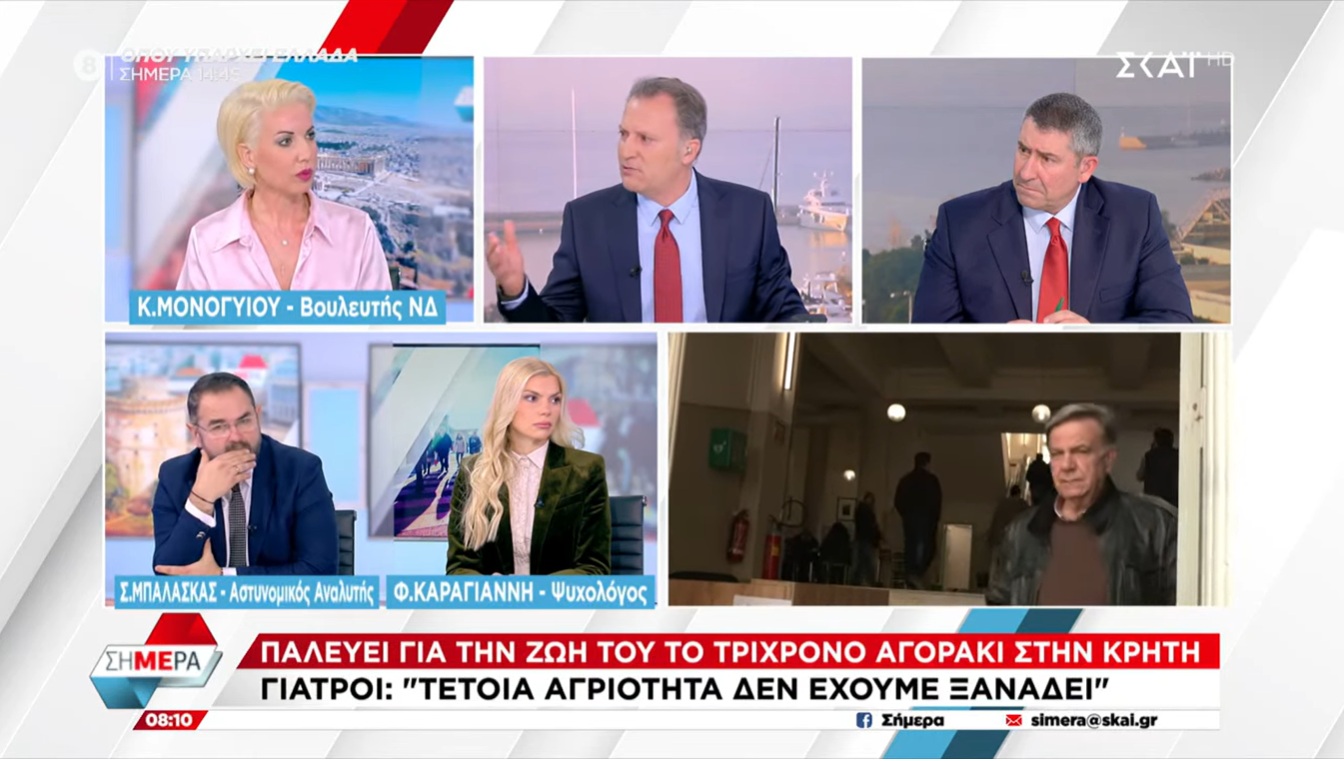 Η βουλευτής Κυκλάδων της Νέας Δημοκρατίας, Κατερίνα Μονογυιού, συμμετείχε στην εκπομπή «ΣΗΜΕΡΑ» του τηλεοπτικού σταθμού ΣΚΑΪ, με τους Δημήτρη Οικονόμου και Άκη Παυλόπουλο. Στο επίκεντρο της συζήτησης βρέθηκε το συγκλονιστικό περιστατικό ενδοοικογενειακής βίας με θύμα ένα τρίχρονο παιδί που νοσηλεύεται στην εντατική.
