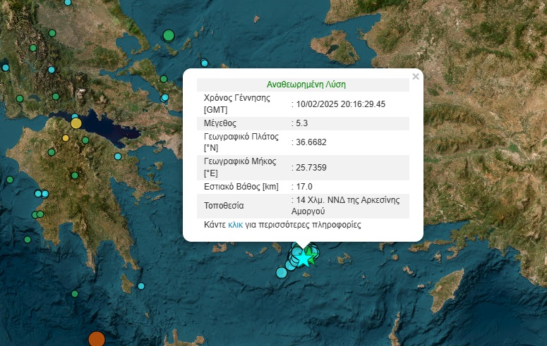 Ο σεισμός έγινε στις 22:16 και το επίκεντρό του εντοπίζεται στα 14 χιλιόμετρα νότια - νοτιοδυτικά της Αρκεσίνης Αμοργού. Το εστιακό βάθος ήταν 17 χιλιόμετρα. Πρόκειται για τον μεγαλύτερο σεισμό που έχει καταγραφεί μέχρι σήμερα στη Σαντορίνη, για όλο το τελευταίο διάστημα.