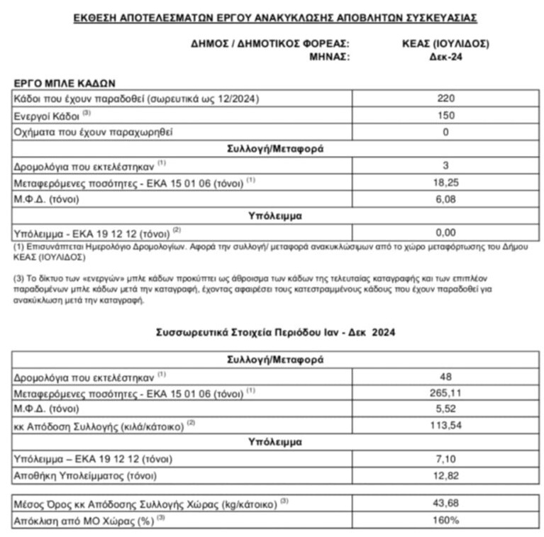 Με προτεραιότητα ένα βιώσιμο μέλλον για το νησί, ο Δήμος Κέας καταγράφει εκ νέου εξαιρετικές επιδόσεις στον τομέα της ανακύκλωσης, σύμφωνα με τα αποτελέσματα της χρονιάς που πέρασε.