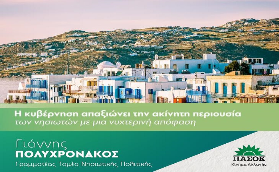 Σφοδρή κριτική στην κυβέρνηση ασκεί ο Τομεάρχης Νησιωτικής Πολιτικής του ΠΑΣΟΚ, Γιάννης Πολυχρονάκος, με αφορμή την αιφνίδια εφαρμογή Προεδρικού Διατάγματος του Υπουργείου Περιβάλλοντος, το οποίο τέθηκε σε ισχύ τη Μεγάλη Τρίτη. Το νέο πλαίσιο απαγορεύει τη δόμηση σε οικόπεδα μικρότερα των δύο στρεμμάτων σε οικισμούς με πληθυσμό κάτω των 2.000 κατοίκων.