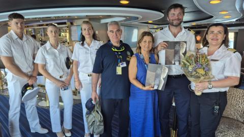 Αντιπροσωπεία του Δήμου Πάρου και του Λιμενικού Σώματος πραγματοποίησε επίσημη επίσκεψη στο κρουαζιερόπλοιο, καλωσορίζοντας θερμά τον καπετάνιο και τα μέλη του πληρώματος. Κατά τη διάρκεια της επίσκεψης, πραγματοποιήθηκε ενημέρωση για τους σκοπούς και τη φιλοσοφία της κρουαζιέρας, καθώς και ξενάγηση στους χώρους του πλοίου. Η επίσκεψη ολοκληρώθηκε με την ανταλλαγή αναμνηστικών δώρων, σε φιλόξενο κλίμα.