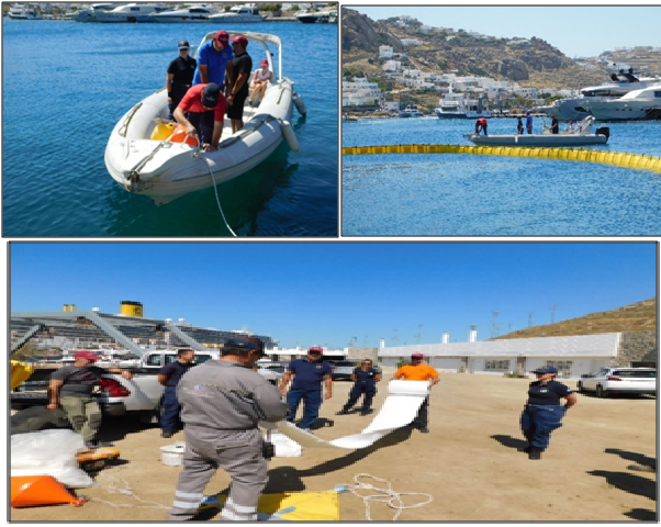 Αμέσως μετά εκτελέστηκε η προγραμματισμένη Άσκηση Αντιρρύπανσης που αφορούσε υποτιθέμενη διαρροή πετρελαιοειδών αποβλήτων από Σκάφος το οποίο ήταν πρυμνοδετημένο στο Νέο Λιμένα της Μυκόνου. Για την αντιμετώπισή της υποτιθέμενης διαρροής, μεταφέρθηκε με τη βοήθεια του οχήματος 4 Χ 4 του ΔΛΤ, η μπαγκαζιέρα όπου υπάρχουν πάντα 150 μέτρα πλωτών φραγμάτων ανοικτής θαλάσσης και με τη συνδρομή του σκάφους του εθελοντή κ. Δημήτριου Βάγια, πραγματοποιήθηκε η έλξη των απαραίτητων για το σενάριο, πλωτών φραγμάτων με σκοπό να εγκλωβιστεί η ρύπανση μέσα σε αυτά. Στη συνέχεια, το φράγμα αγκυροβολήθηκε, με σκοπό να εγκλωβίσει τη μέγιστη ποσότητα ρίπων. Για την ολοκλήρωση της διαδικασίας, τοποθετήθηκαν τα κατάλληλα απορροφητικά υλικά (φράγματα) στις άκρες του, με σκοπό να μην επιτραπεί στην υποτιθέμενη διαρροή να διαφύγει από τα κενά που πάντα υπάρχουν.