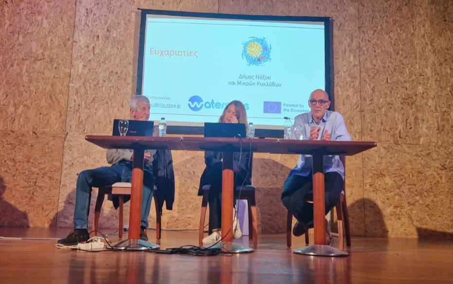 Χαιρετισμούς απηύθυναν ο δήμαρχος Νάξου και Μικρών Κυκλάδων, Δημήτρης Λιανός και ο καθηγητής Υδρολογίας του ΕΜΠ, Νίκος Μαμάσης, ενώ την παρουσίαση των στόχων του έργου έκαναν η Δρ. Θεανώ Ηλιοπούλου, επιστημονικά υπεύθυνη του προγράμματος και ο Δρ. Γ.Φοίβος Σαργέντης, κύριος ερευνητής.