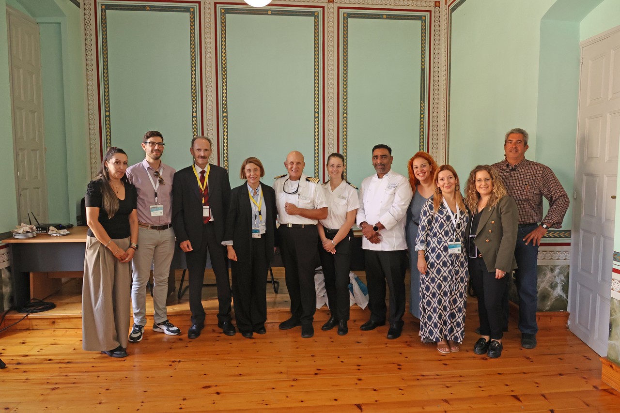 Το Επιμελητήριο Κυκλάδων, στο πλαίσιο επαφών με εταιρείες του κλάδου με σκοπό την προώθηση των τοπικών προϊόντων που φέρουν το σήμα ποιότητας Aegean Cuisine, κάλεσε τον Πλοίαρχο, τον Σεφ και μέλη του πληρώματος κρουαζιερόπλοιου του Ομίλου AZAMARA, που βρισκόταν στη Σύρο κατά τη διάρκεια του διημέρου. Η πρόσκληση έγινε αποδεκτή και το μεσημέρι της Παρασκευής 17 Οκτωβρίου πραγματοποιήθηκε συνάντηση σε πολύ θερμό κλίμα (φωτογραφία).