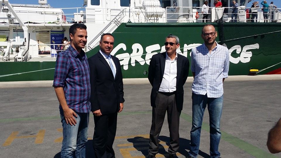 Οι εκπρόσωποι της Μη Κυβερνητικής Οργάνωσης Greenpeace κ. Τάκης Γρηγορίου, Υπεύθυνος για θέματα Ενέργειας & Κλιματικών Αλλαγών και Δημήτρης Ιμπραήμ, Συντονιστής Εκστρατειών, ενημέρωσαν τον κ. Χατζημάρκο για τον σκοπό της επίσκεψης του πλοίου στη Ρόδο και για τις ενέργειες που κάνει η οργάνωση ώστε να ενημερωθούν οι τοπικές αρχές των νησιών αλλά και οι πολίτες για τις δυνατότητες και τις επιλογές που υφίστανται προς την κατεύθυνση της εξοικονόμησης στην κατανάλωση ενέργειας, στη μείωση των εκπομπών ρύπων και του ενεργειακού αποτυπώματος των επιχειρήσεων αλλά και των κτηρίων δημόσιων και ιδιωτικών (δηλ. τα νοικοκυριά).