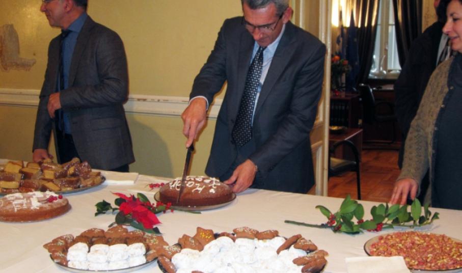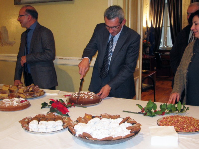 Το απόγευμα της ίδιας ημέρας ο Περιφερειάρχης παρίστατο στην κοπή της πίτας των εργαζομένων της Περιφέρειας Νοτίου Αιγαίου στο κτήριο της πλατείας Τσιροπινά όπου απευθυνόμενος στους εργαζομένους δήλωσε: «Τα χρόνια μπροστά μας, χρόνια μεταβατικά. Είναι περίοδος που η χώρα θα αλλάξει σημαντικά. Πολλά από αυτά τα οποία κρίνονται στην κοινωνία, θα καθοριστούν από το πόσο θα αντέξει η Αυτοδιοίκηση Α΄ και Β΄ Βαθμού. Από το πόσο ευρηματική θα γίνει γιατί είναι γνωστό πως είναι στη γωνία και θεσμικά και οικονομικά. Οι απαιτήσεις είναι πάρα πολύ μεγάλες από όλους που υπηρετούν την Αυτοδιοίκηση. Είναι μία μεγάλη μάχη για τη χώρα και τα νησιά μας λόγω του γεωγραφικού φυσικού κατακερματισμού του Νοτίου Αιγαίου. Τις υπηρεσίες μας και τους ανθρώπους μας τους χωρίζει το Αιγαίο και πολλές μέρες ταξιδιού. Είναι μεγάλες οι προκλήσεις, μεγάλες και οι αντοχές που πρέπει να επιδείξουμε και μόνο με συνεργασία και δουλειά θα καταστήσουμε αυτό τον Οργανισμό αποτελεσματικό».