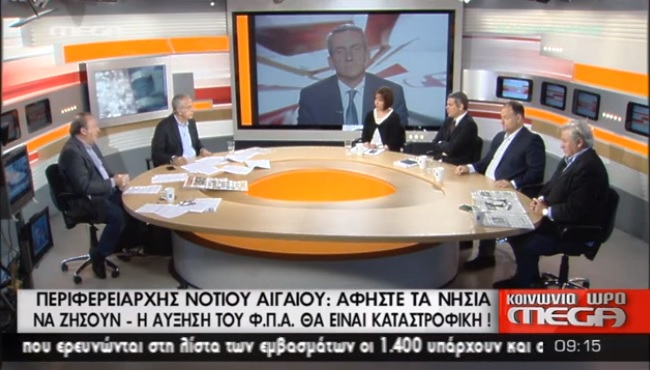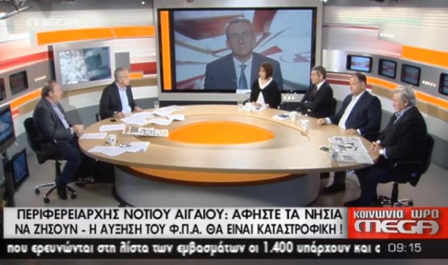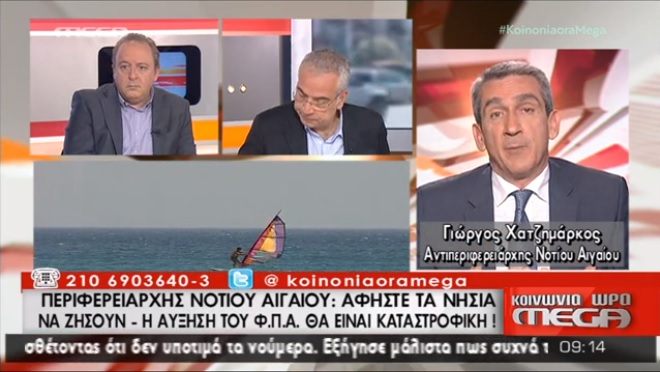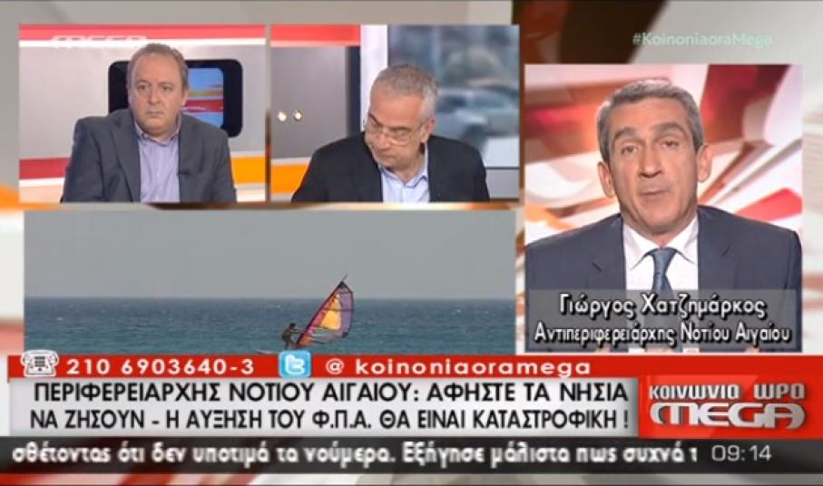 Προσκεκλημένος ομιλητής στην εκπομπή “Κοινωνία Ώρα MEGA” σήμερα το πρωί ήταν ο Περιφερειάρχης Νοτίου Αιγαίου, Γιώργος Χατζημάρκος, ο οποίος μίλησε για το θέμα του ΦΠΑ στα νησιά.