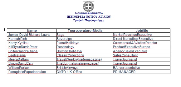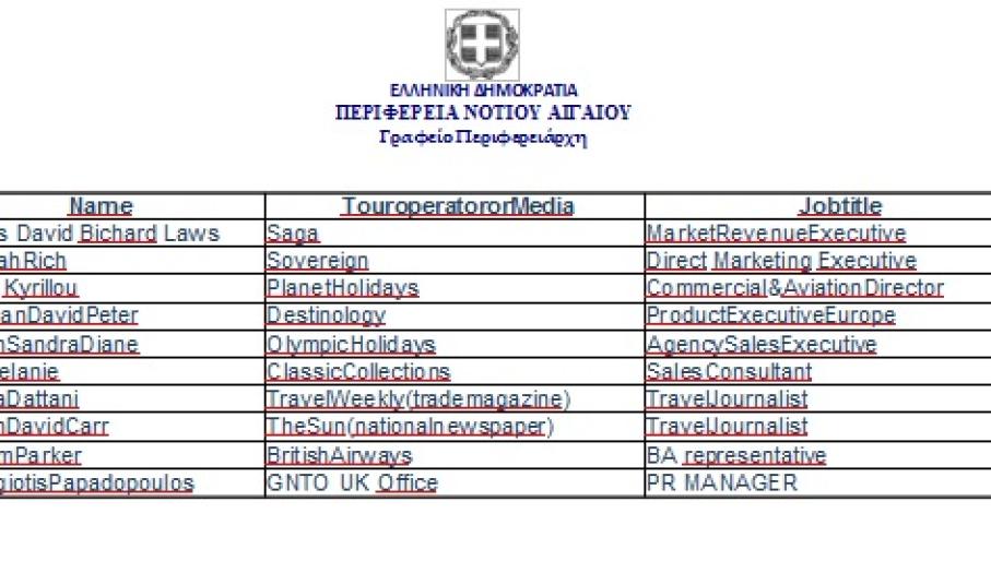 Επισυνάπτεται η φωτογραφία με τη λίστα των Βρετανών tour operators και εκπροσώπων ΜΜΕ.